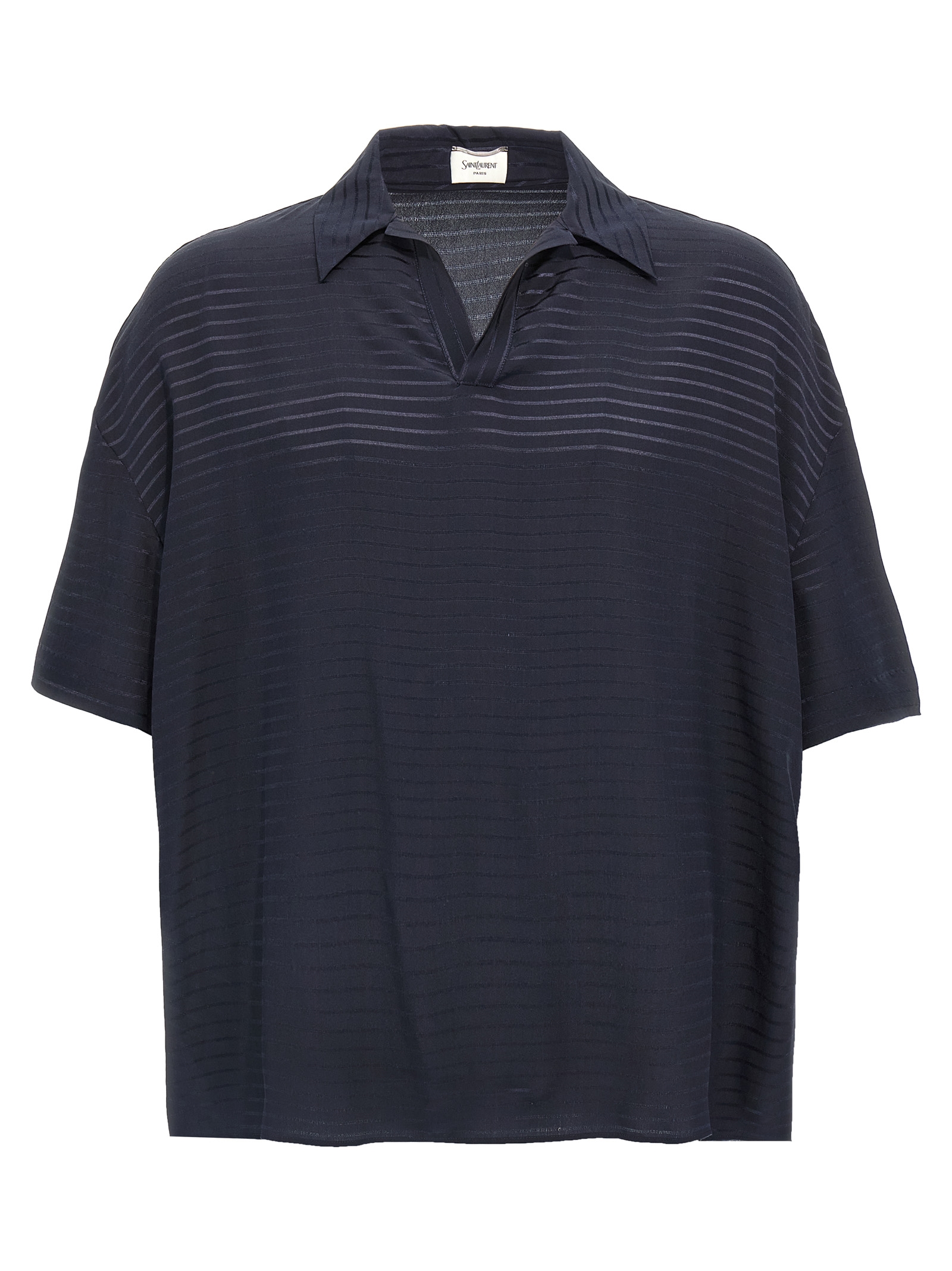 Light silk striped polo shirt, V-neck, collar, short sleeves with dropped shoulders.