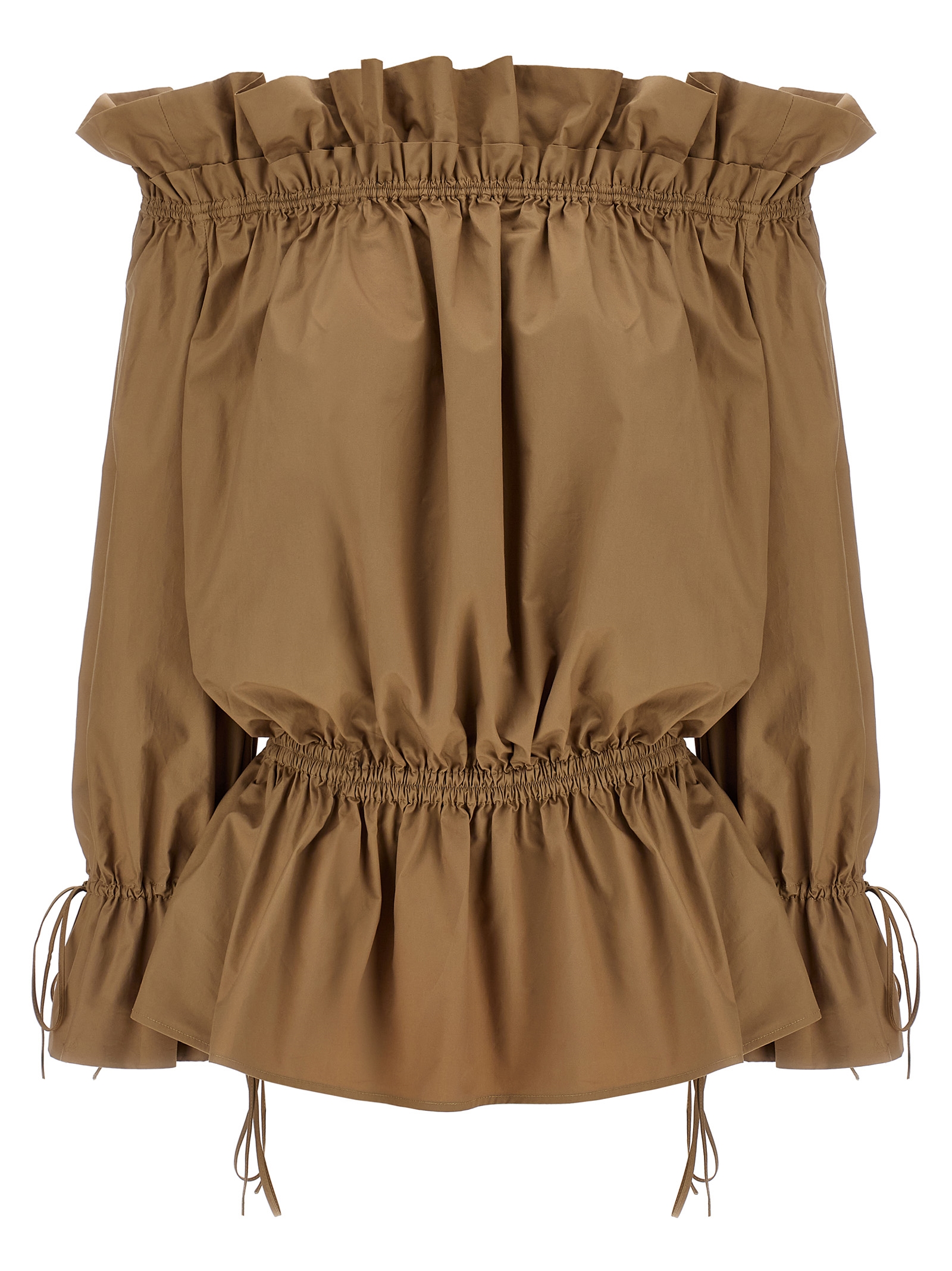 Off-the-shoulder cotton mini dress with elastic curling and ruffles, long sleeves with drawstring cuffs, elastic waistband, pockets, side drawstrings.Өнімнің ерекшеліктері
