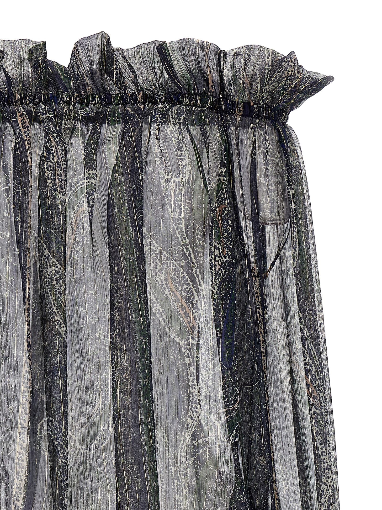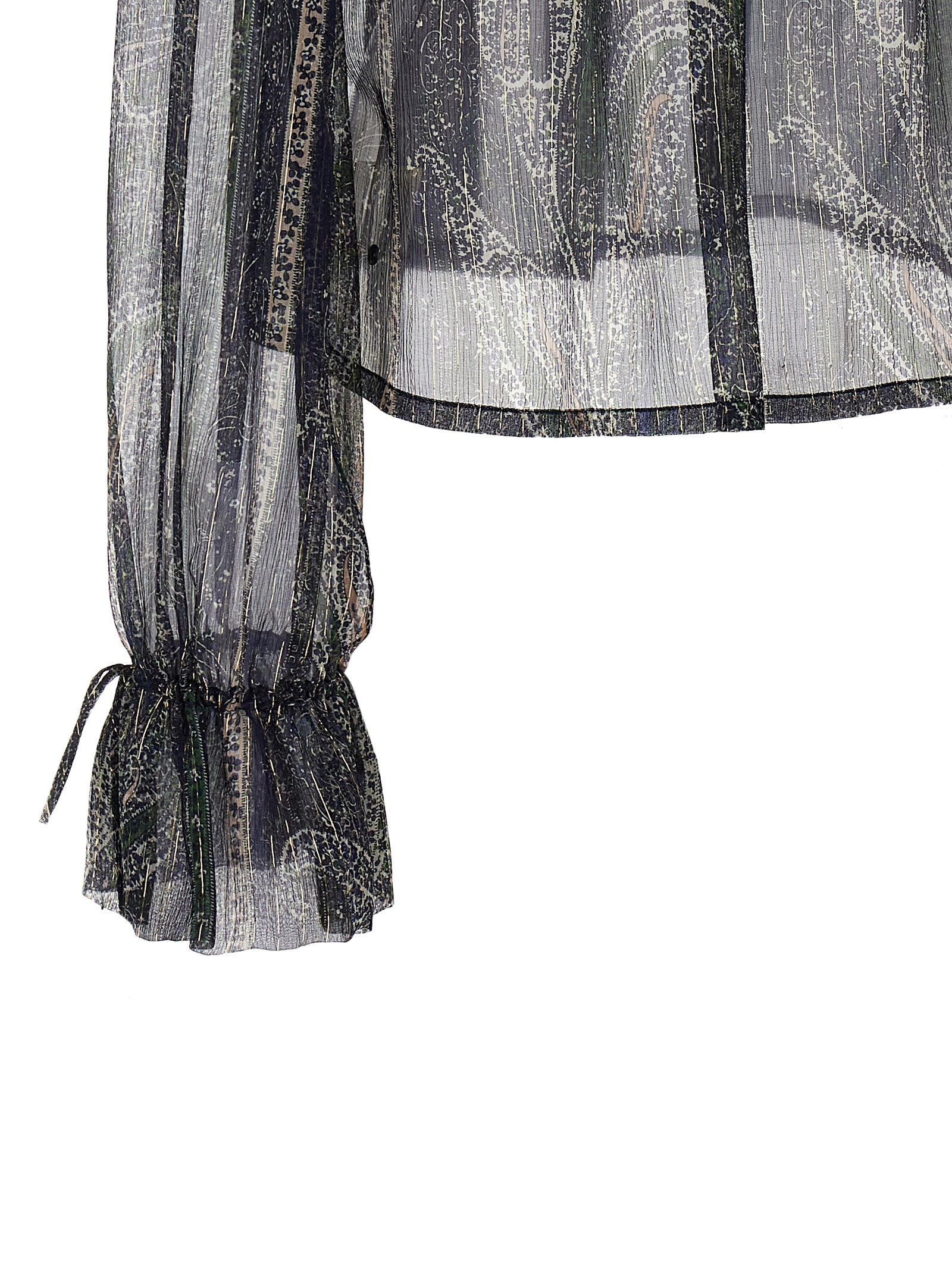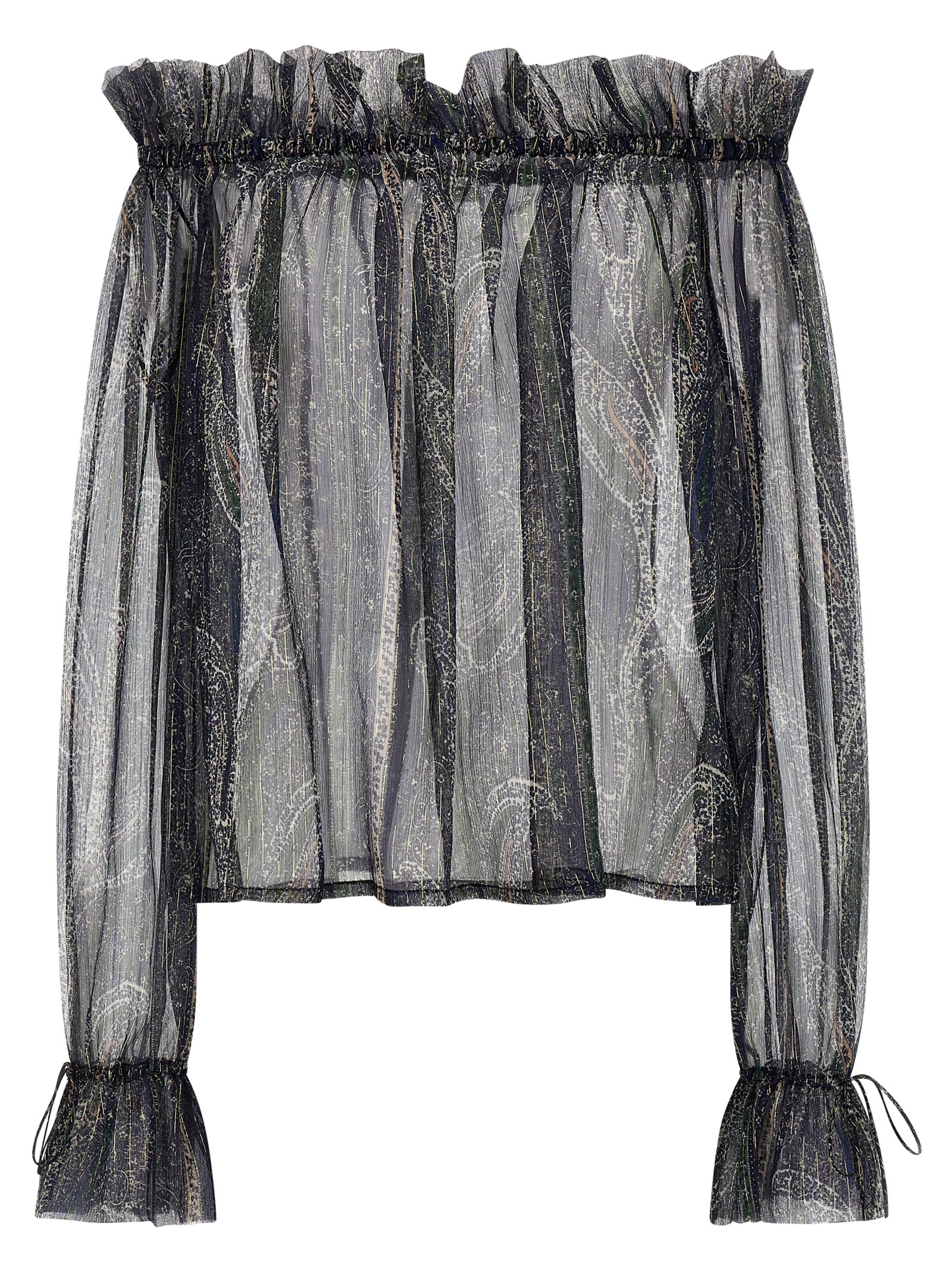 Paisley motif silk crépon blouse in lurex, off-the-shoulder model, ruffled collar, long sleeves with poet cuffs with drawstring.Өнімнің ерекшеліктері
