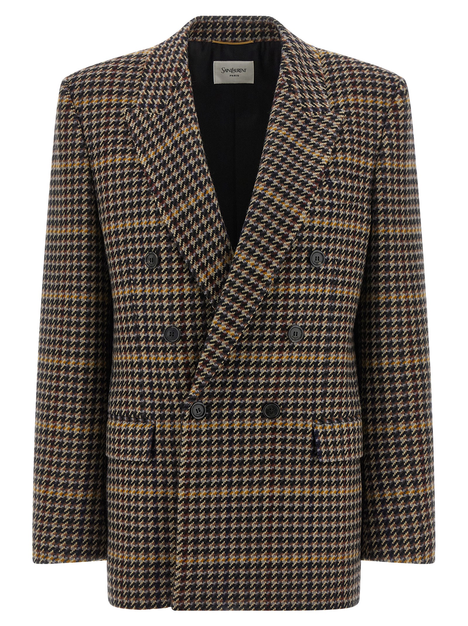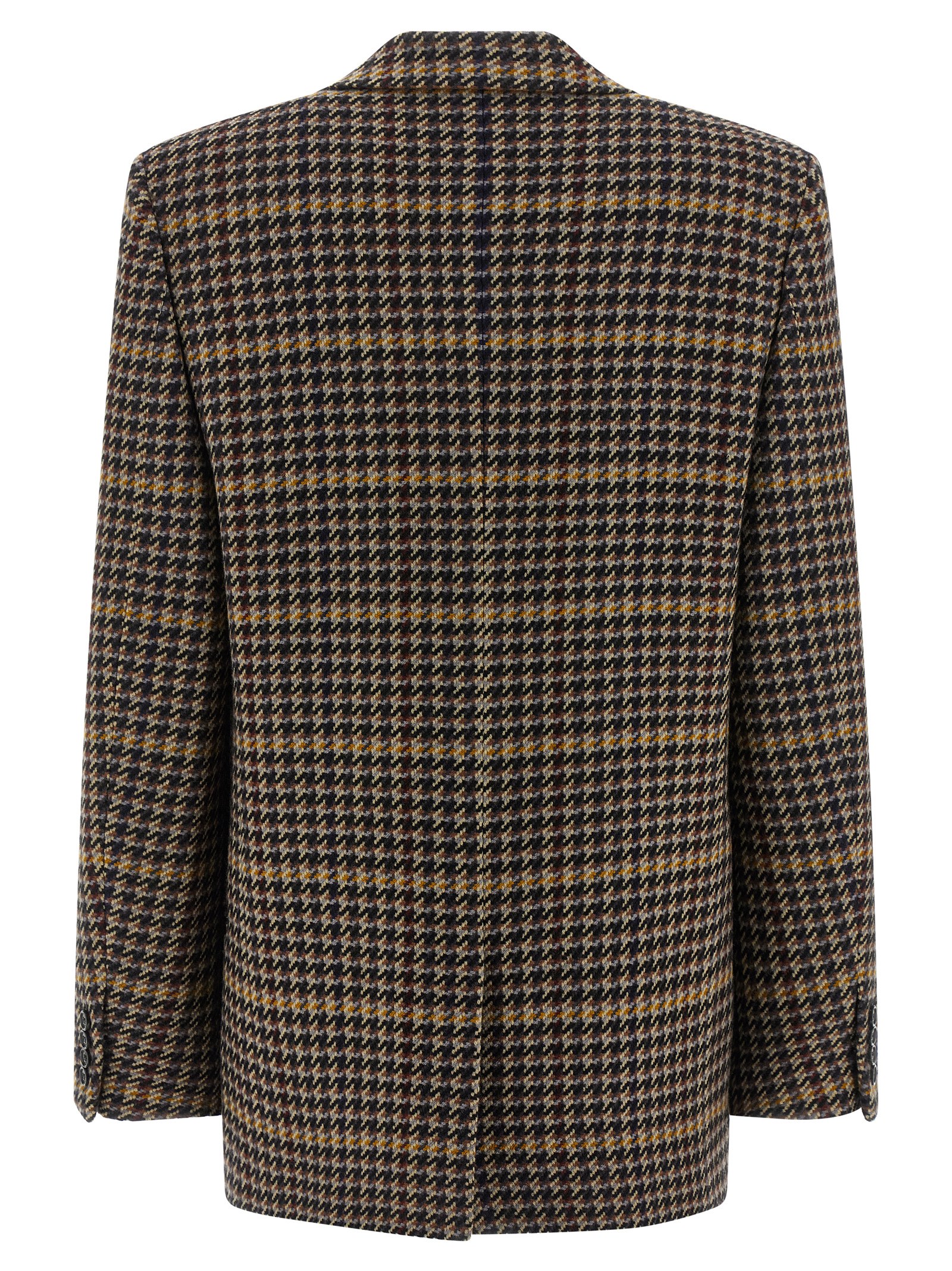 Houndstooth patterned wool blazer jacket with double-breasted model with front button closure, peak lapels, breast pocket, flap pockets, padded shoulders, long sleeves, back split, silk lining.