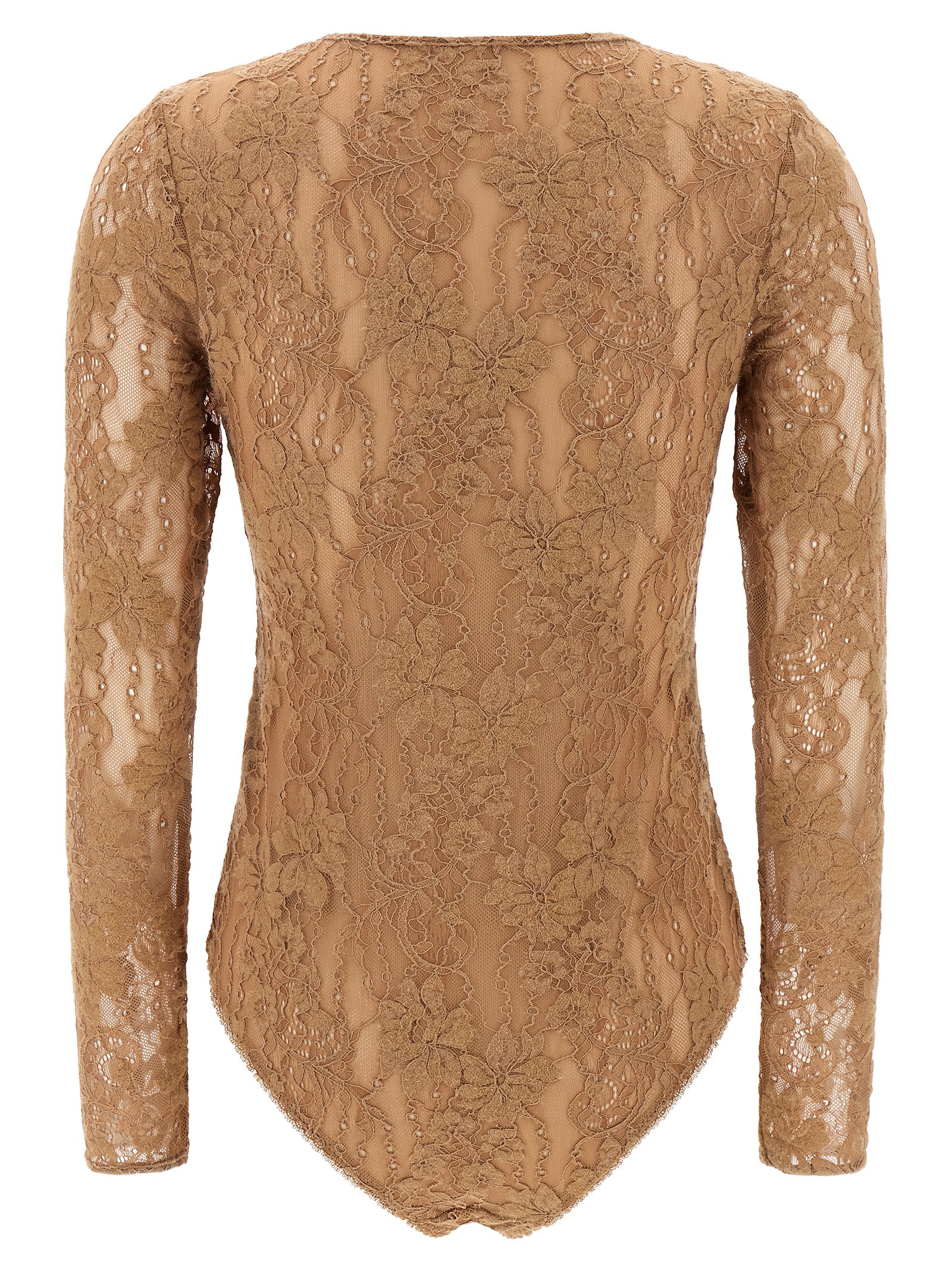 Stretch lace bodysuit, crew neck, long sleeves, mesh lining, snap buttons on the hem.