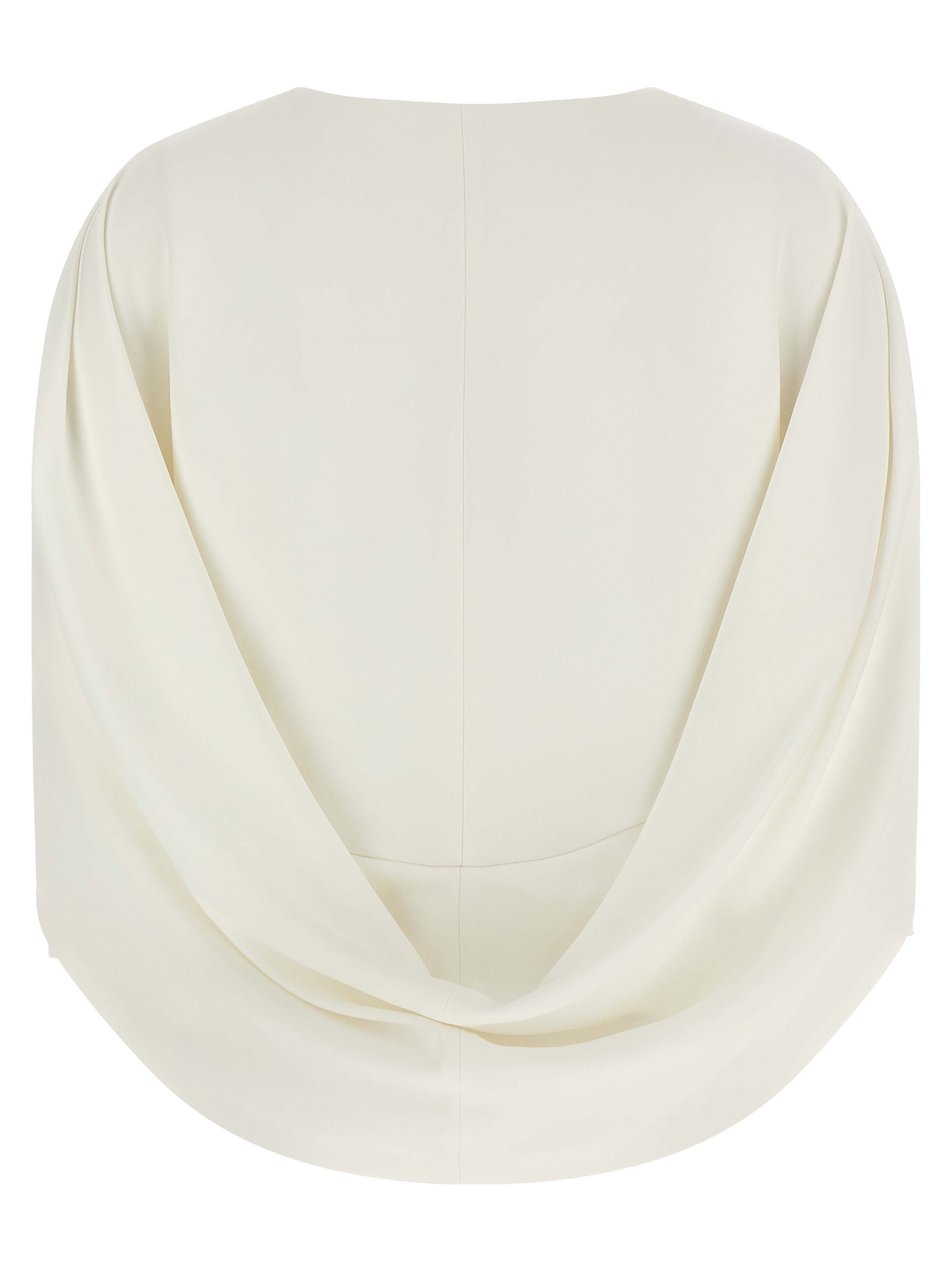 Stretch cady top, cape insert on the shoulders with back draping, V-neck with removable drawstring, side zip closure, symmetrical hem.