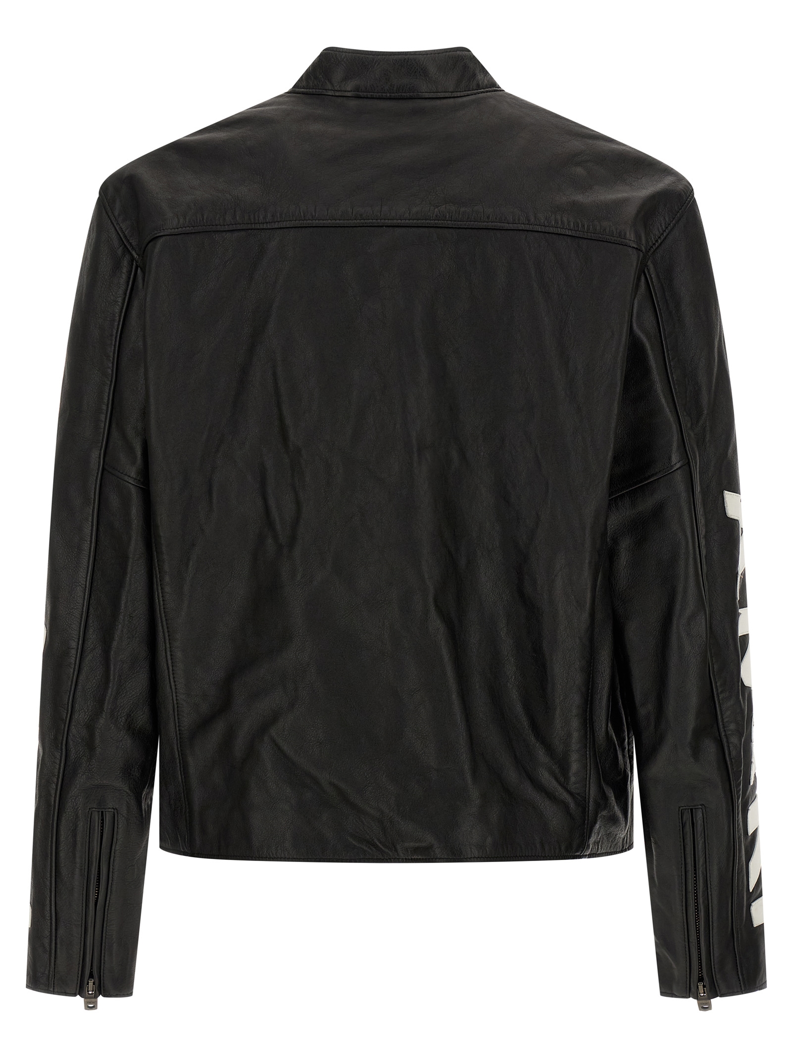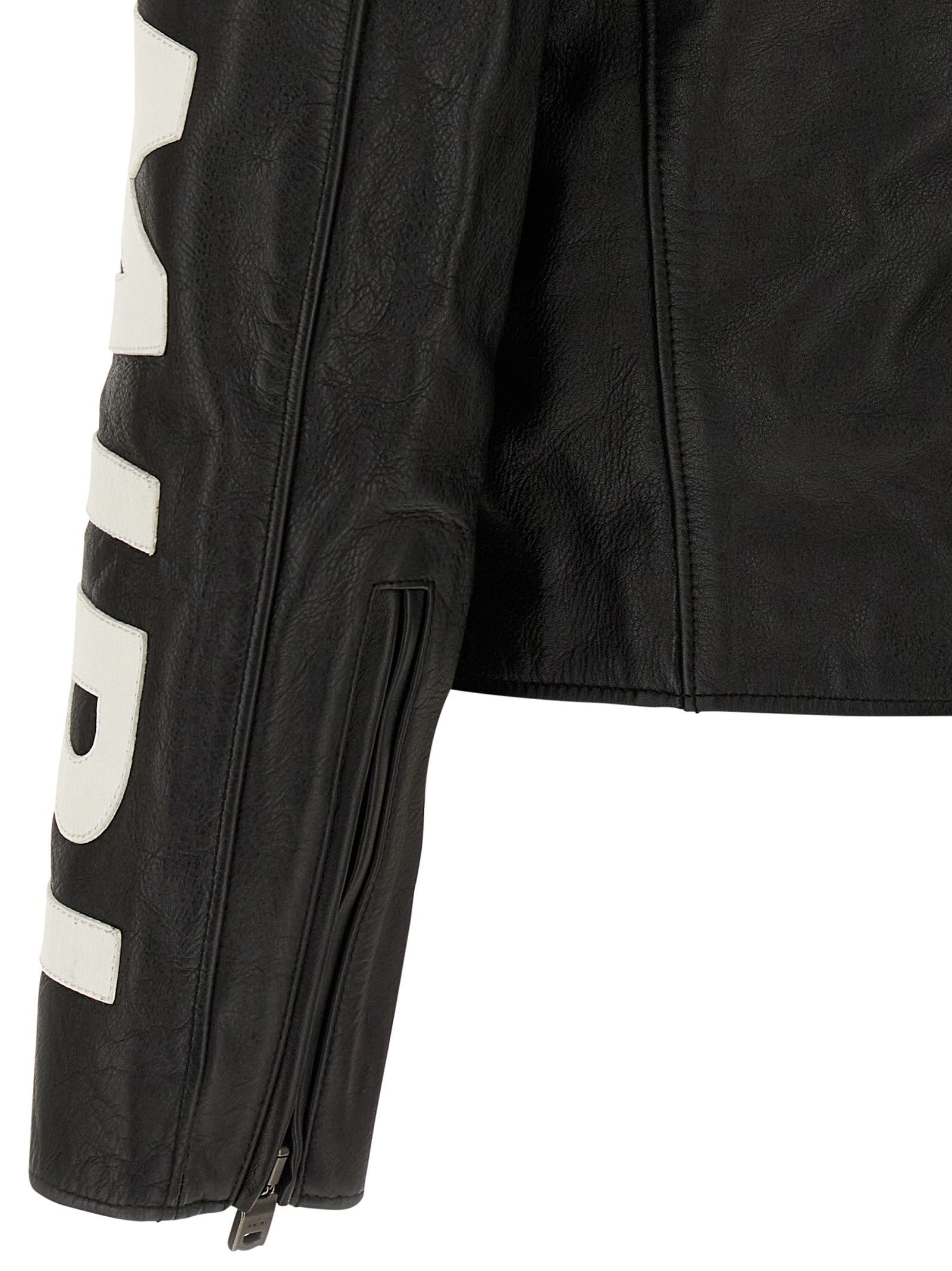 'Amiri Patch Racer' aged leather jacket with logo patch, mandarin collar, front zip closure, pockets, long sleeves with zip on the cuffs.