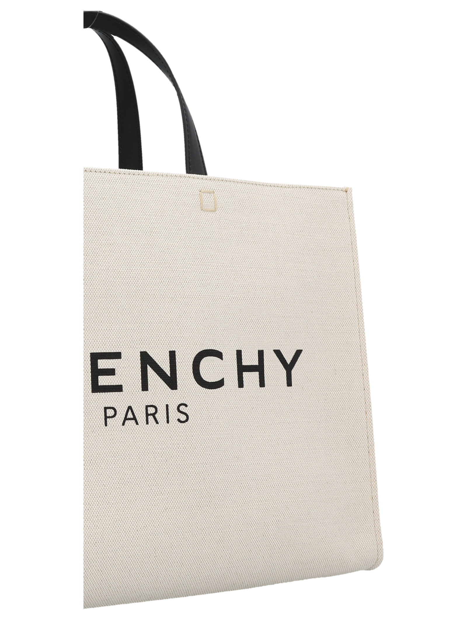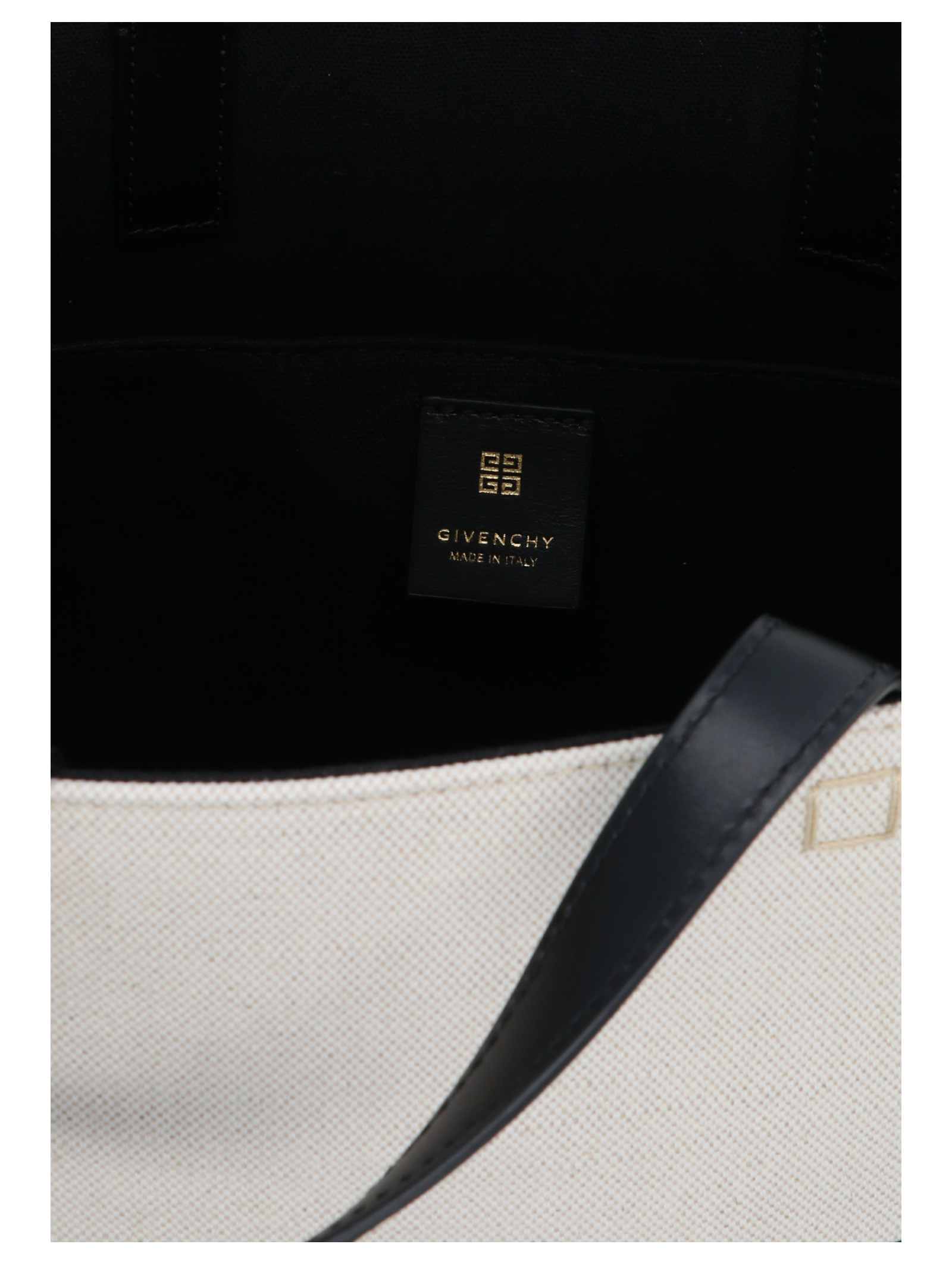 G' cotton and linen canvas midi shopping bag with front logo print, black jacquard canvas shoulder strap with calf leather details and a metal ring, black leather handles, black leather feet with 4G pattern on the bottom, metal details from the gold finish and inner pocket.