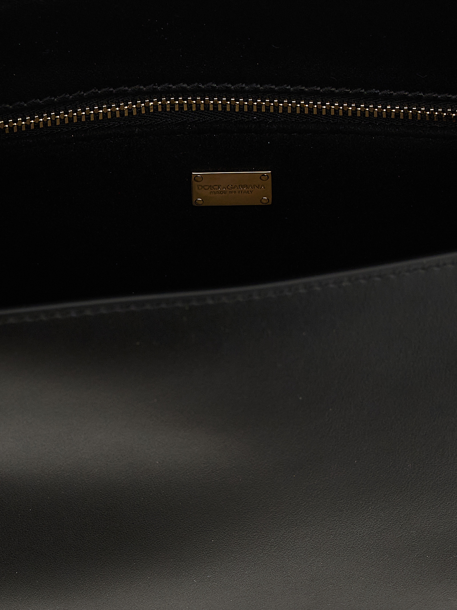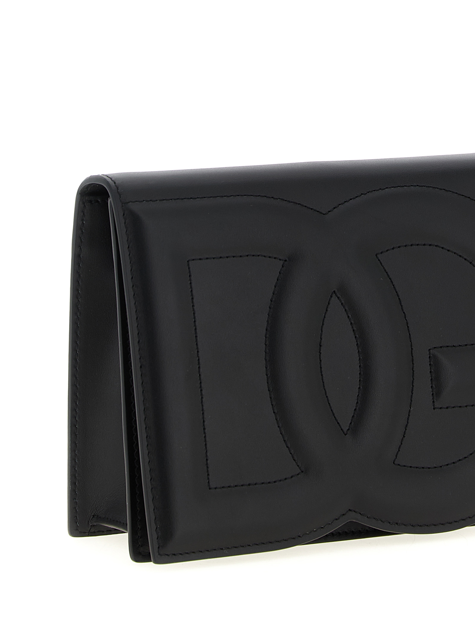 Calf leather crossbody bag with 3D quilted DG logo, adjustable and removable shoulder strap, flap closure with concealed magnet, alcantara lining, zip pocket and strap and snap button compartment.