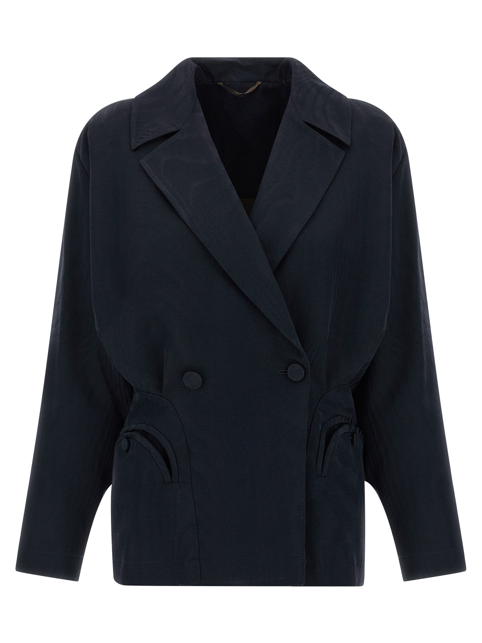 'Sharewood Ares' blazer in cotton blend and moiré viscose, ribbed line with back puff waist, double-breasted style with front covered button closure, 'Smiley' pockets, structured shoulders, long sleeves, monogram viscose lining.