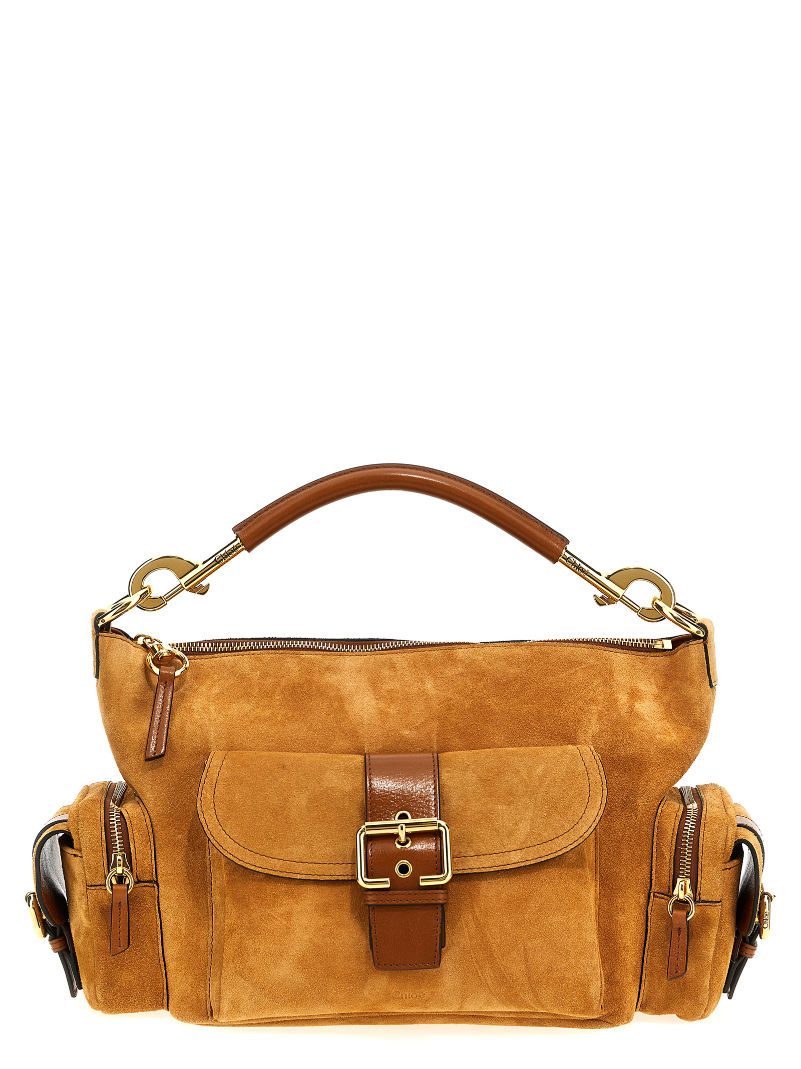 'Camera Bag' suede shoulder bag with leather details, zip closure, removable handle, magnetic flap pockets and pockets with zip closure, metal details, removable shoulder strap.