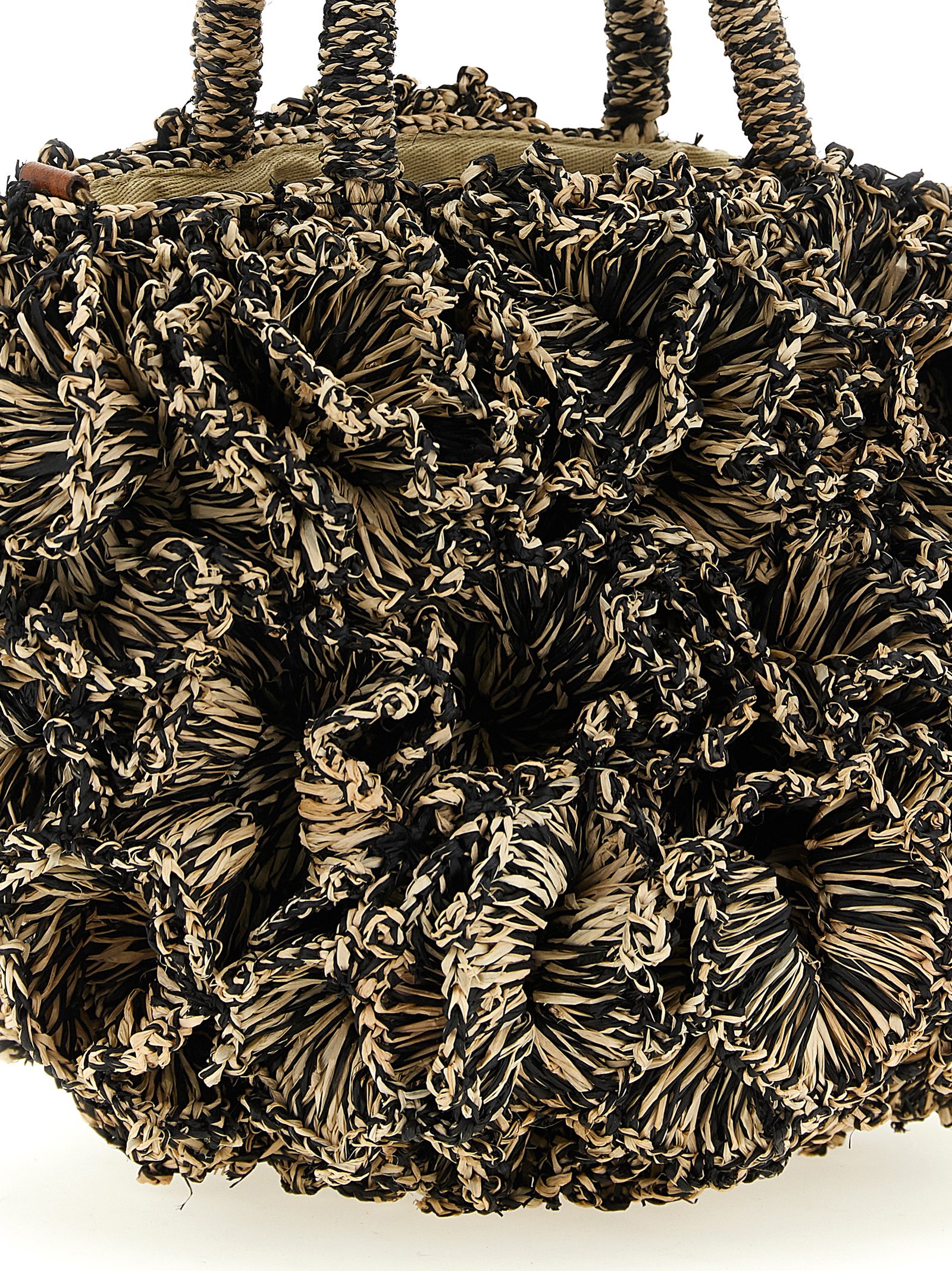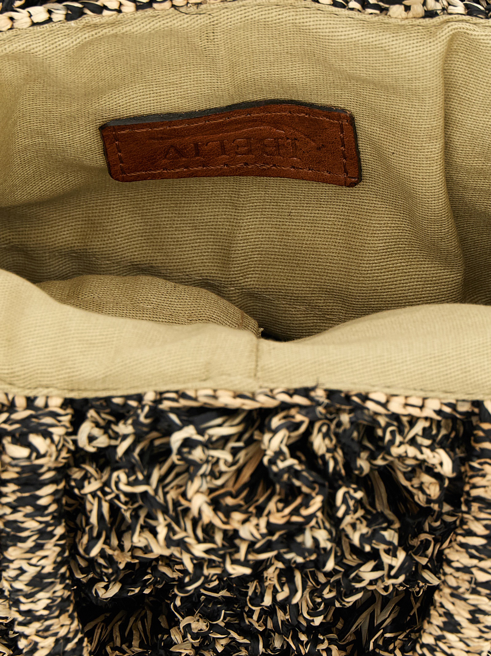 3D әшекейлері бар, баулы сөмке жабылатын, қос бекітілген тұтқасы бар, алынбалы былғары иық бауы бар «маржан» тоқылған рафия сөмкесі. Қолдан жасалған бұйым, кез келген кемшіліктер бірегейліктің белгілері болып саналады.
