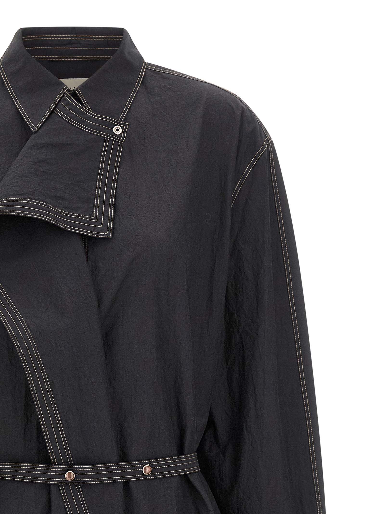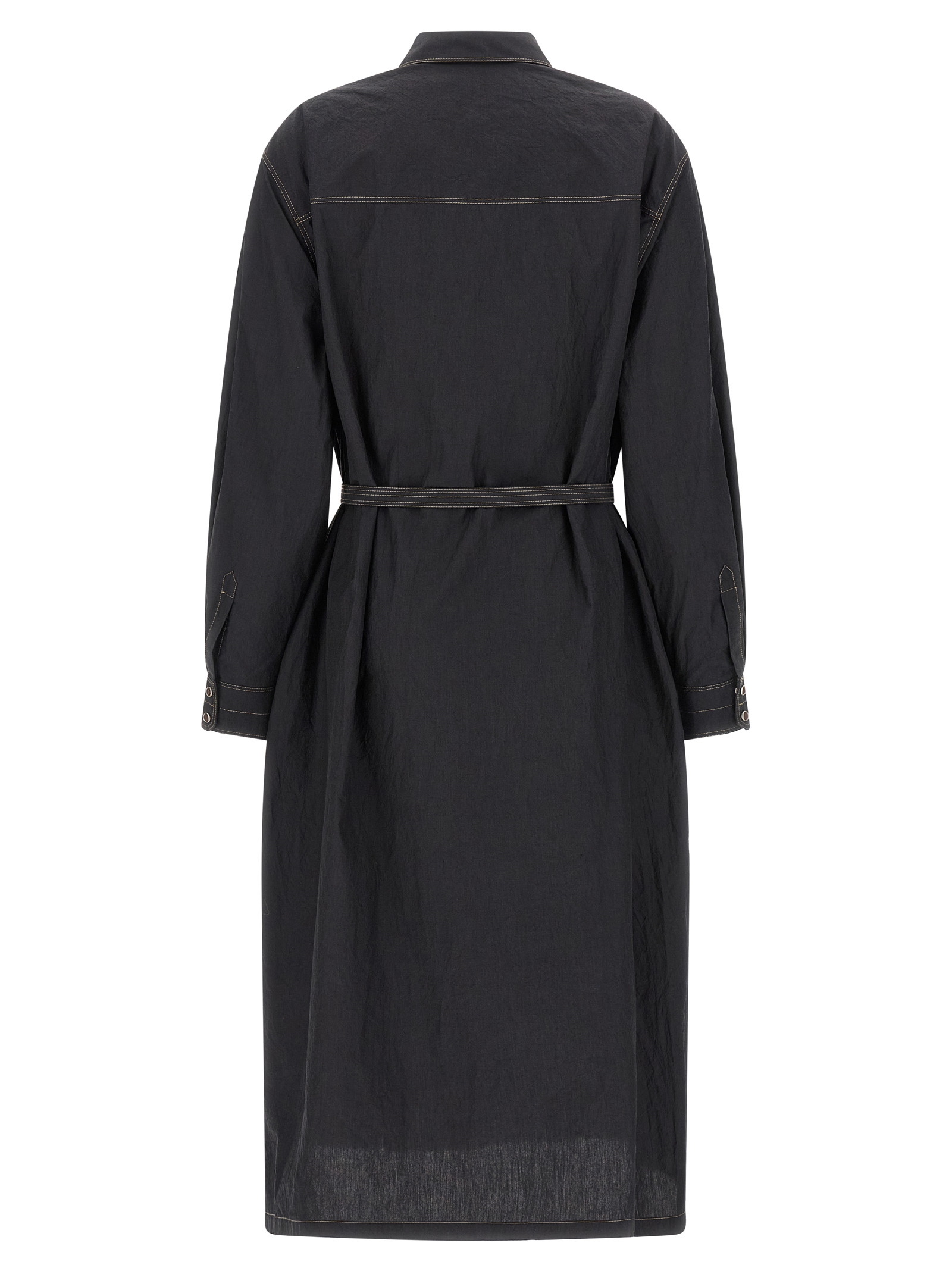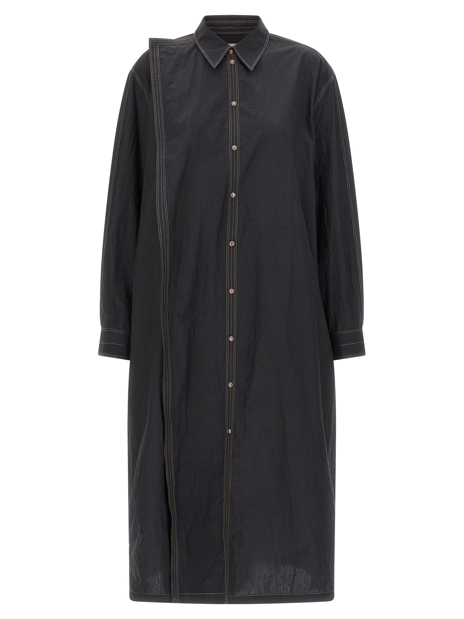 Asymmetrical Shirt' slightly wrinkled cotton crêpe midi dress with contrast stitching, chemisier style, mother-of-pearl snap button closure with panel to button or vacate, pockets, long sleeves with cuffs and dropped shoulder, side slits, removable belt.