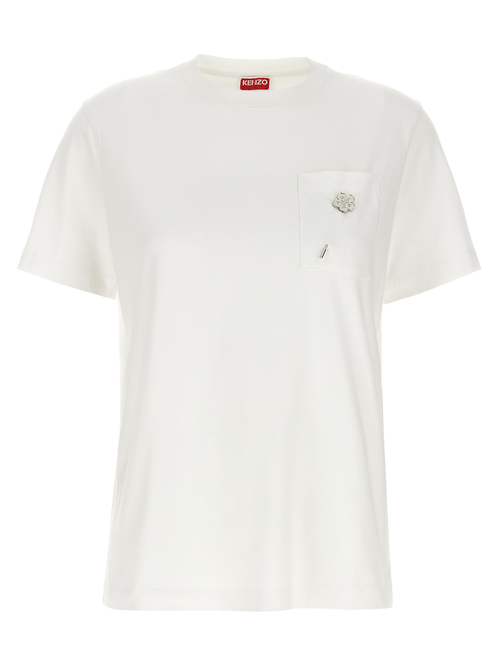 Cotton T-shirt, side pocket with removable brooch detail, back embroidery, short sleeves.