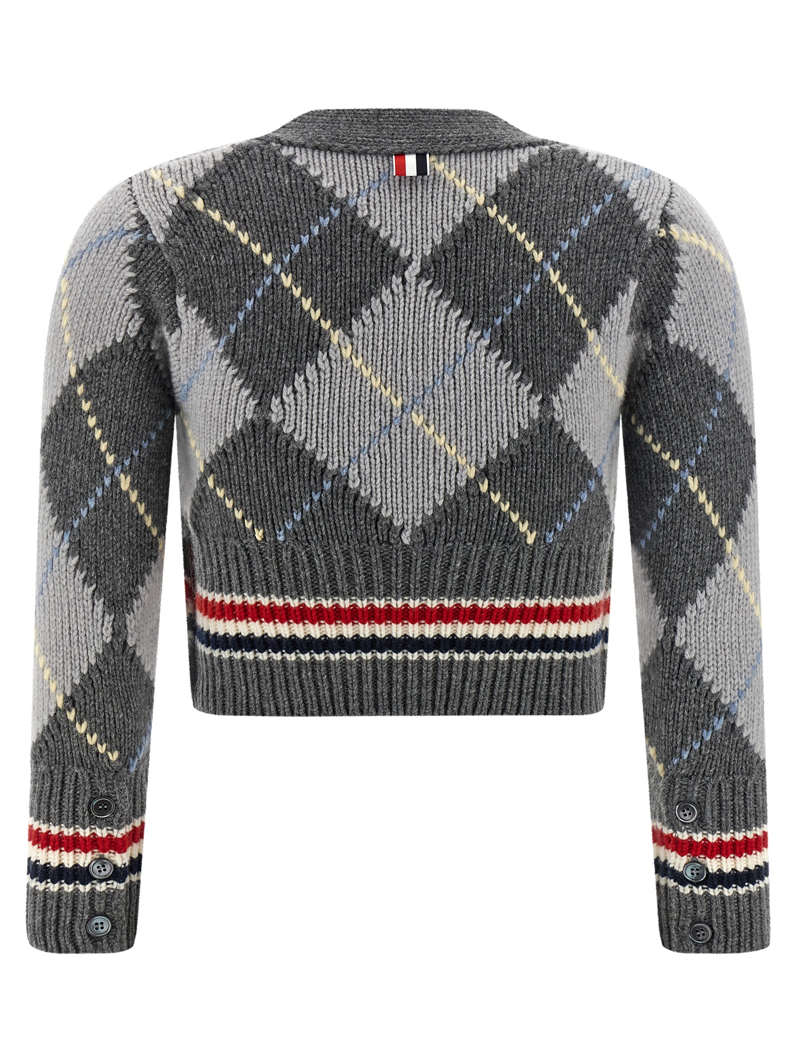 Chunky merino wool cardigan with Argyle pattern inlays and RWB ribbon, crop model, V-neck, front button closure, long sleeves, side slits with buttons.Өнімнің ерекшеліктері