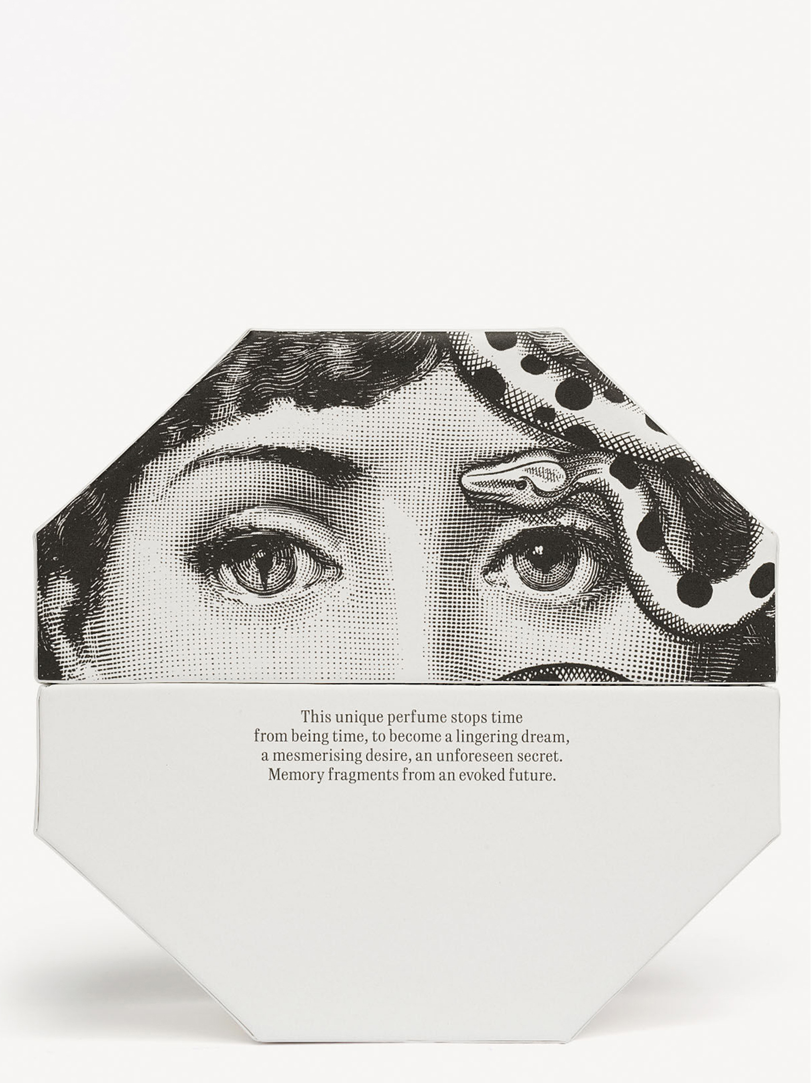 The Frutto Proibito fragrance is visually interpreted by the face of the 19th century opera singer, Lina Cavalieri, who was both a classical beauty with an enigmatic gaze and Fornasetti's muse, and who is now an icon. The woman encounters the temptation of the snake, a reminder of Original Sin.