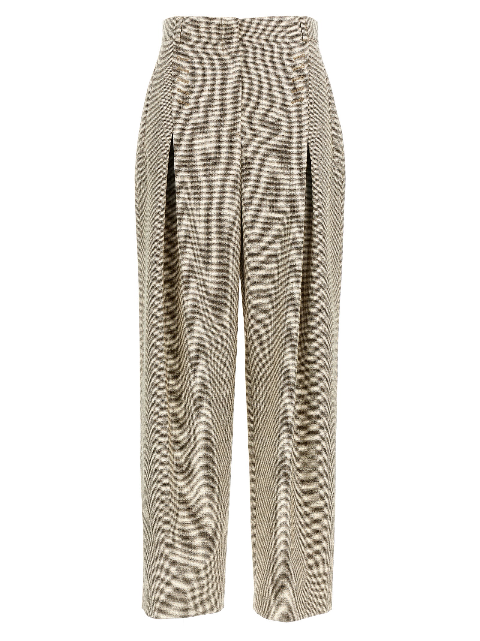 Micro check print wool trousers, trompe l'oeil buttonholes and front pinces, straight leg, high waist model, pockets, hook and button zip closure.