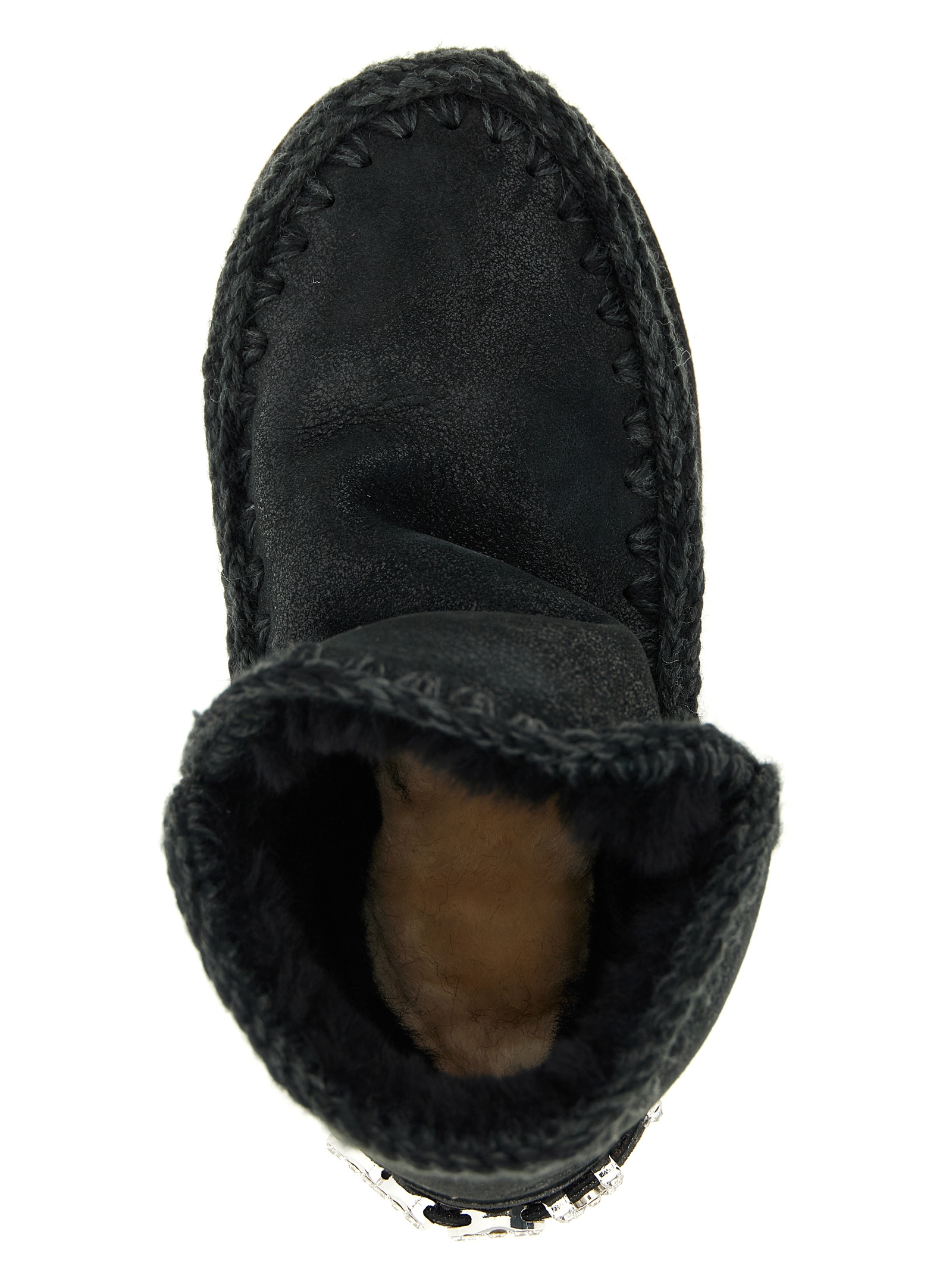 'Eskimo 18 Rhinestone Logo' suede ankle boots with raised stitching, fur lining, rubber sole, back logo.