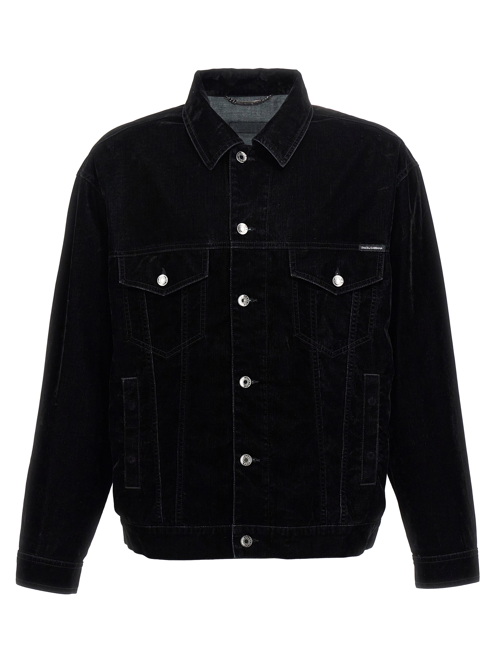 Velvet shirt jacket, denim lining, pockets, button closure, long cuffed sleeves.