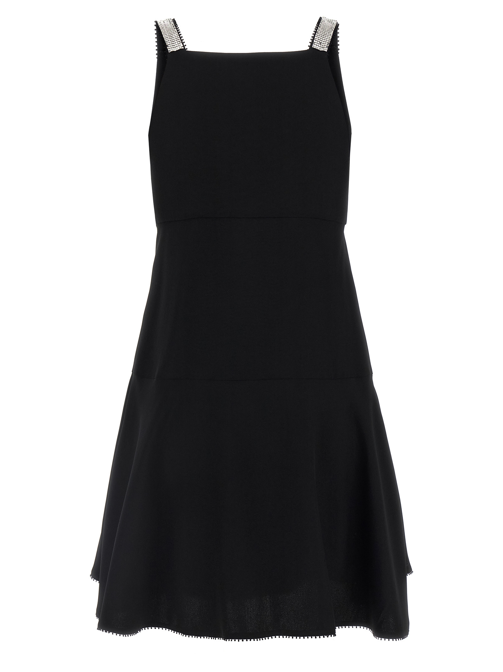 Viscose blend mini dress with micro trimming piping, sleeveless V-neck with ribbon with all-over flat mini studs, front crouches, slits and side zip closure.