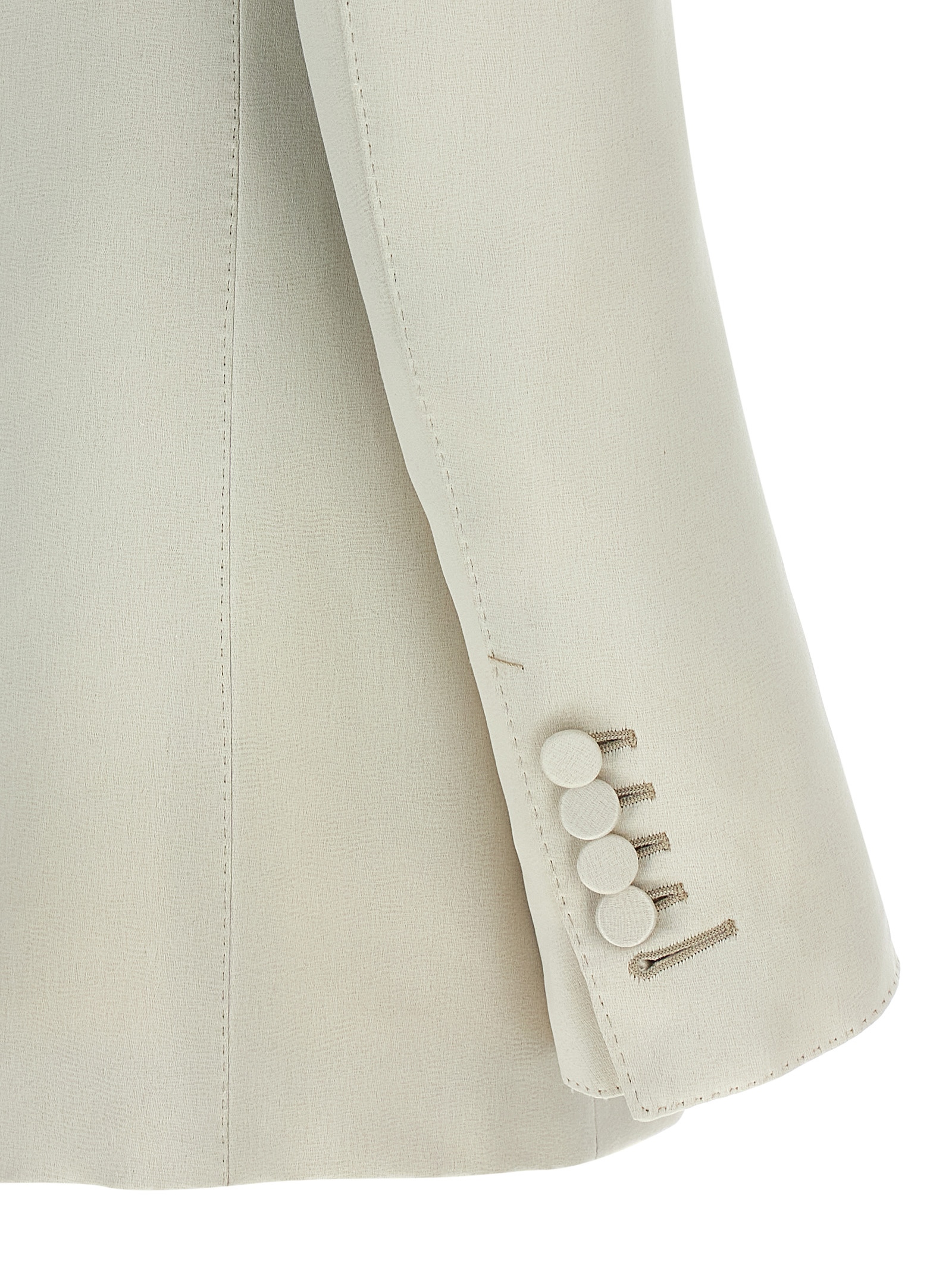 Single-breasted blazer in duchesse blend silk and washed cotton with front button closure, mirror lapels, breast pocket, flap pockets, pointed padded shoulder strap, long sleeves, back split, cupro and silk blend lining.