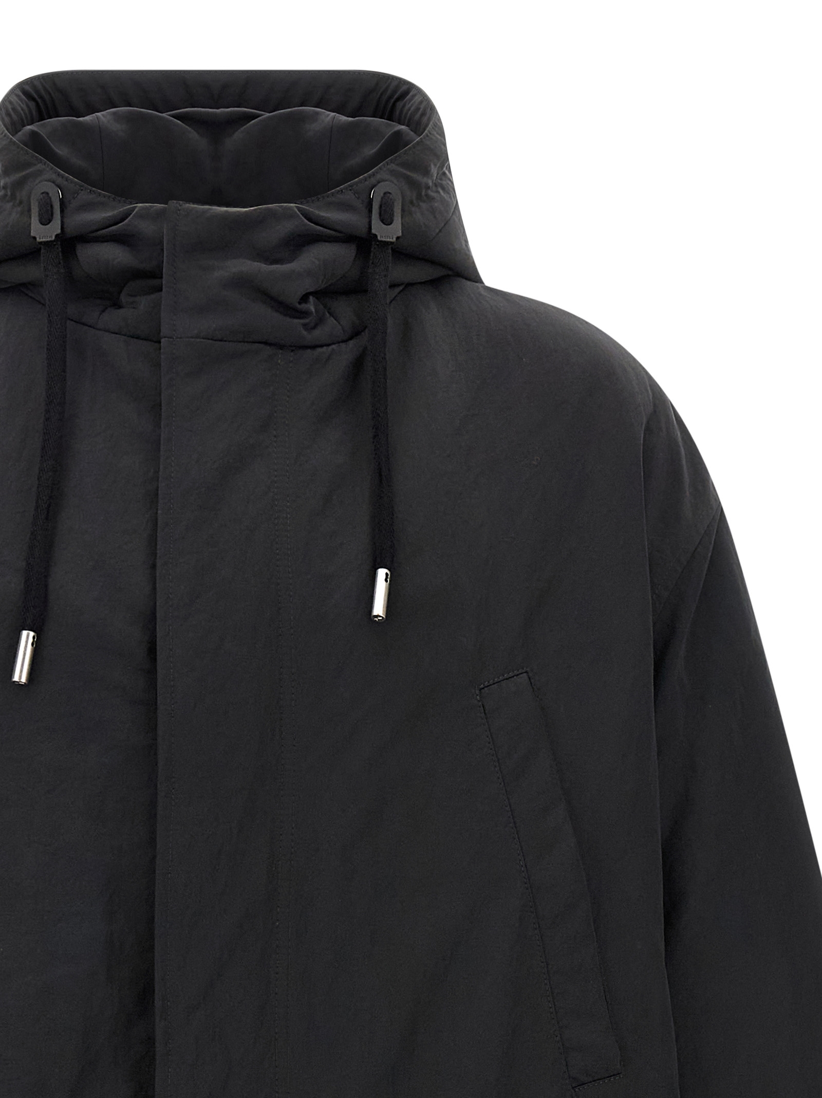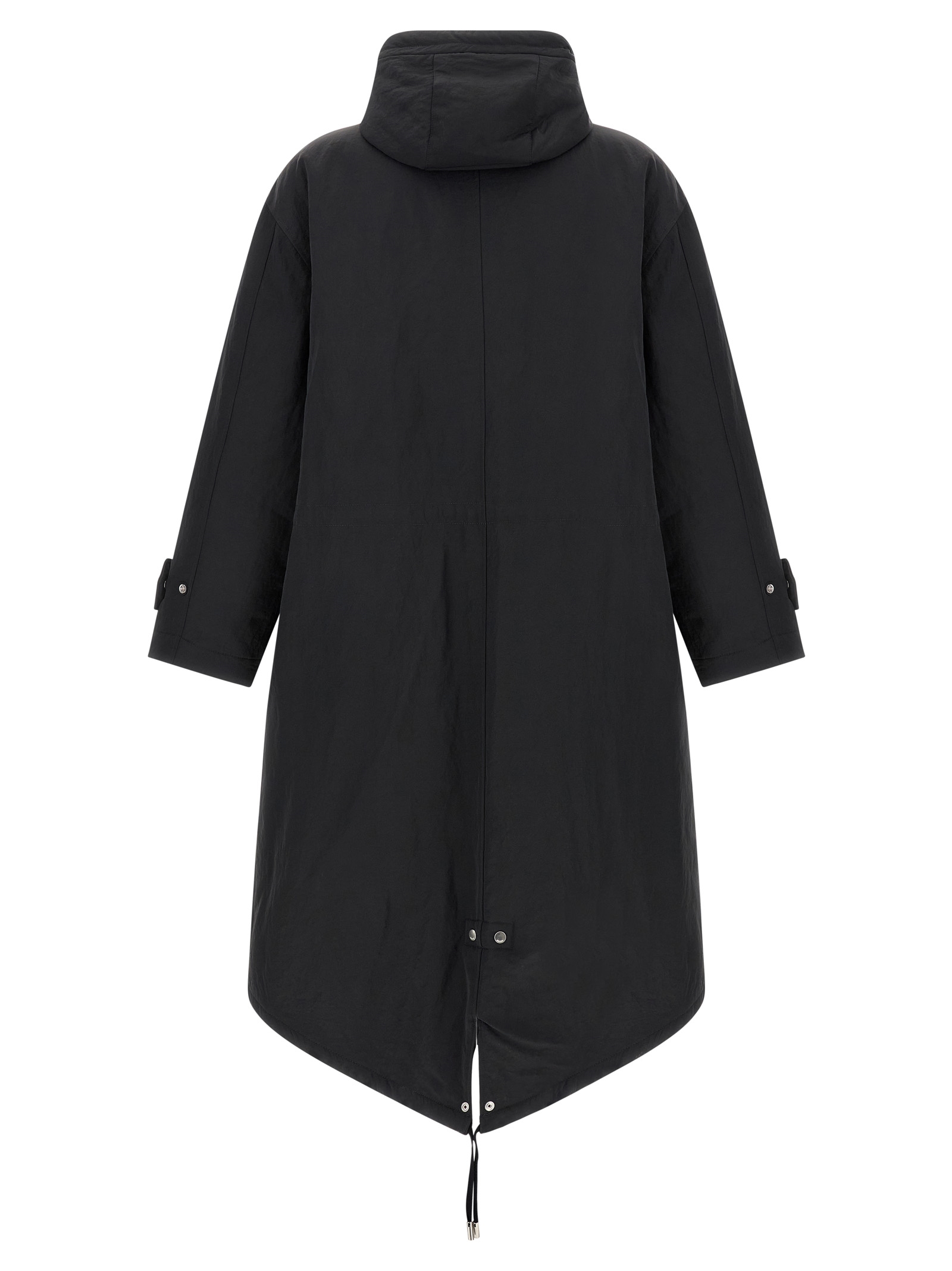 Padded fabric long parka, quilted lining, adjustable hood, front zip and snap button closure, pockets, drawstring at the waist, long sleeves, back split with snap button, drawstring at the hem.Өнімнің ерекшеліктері