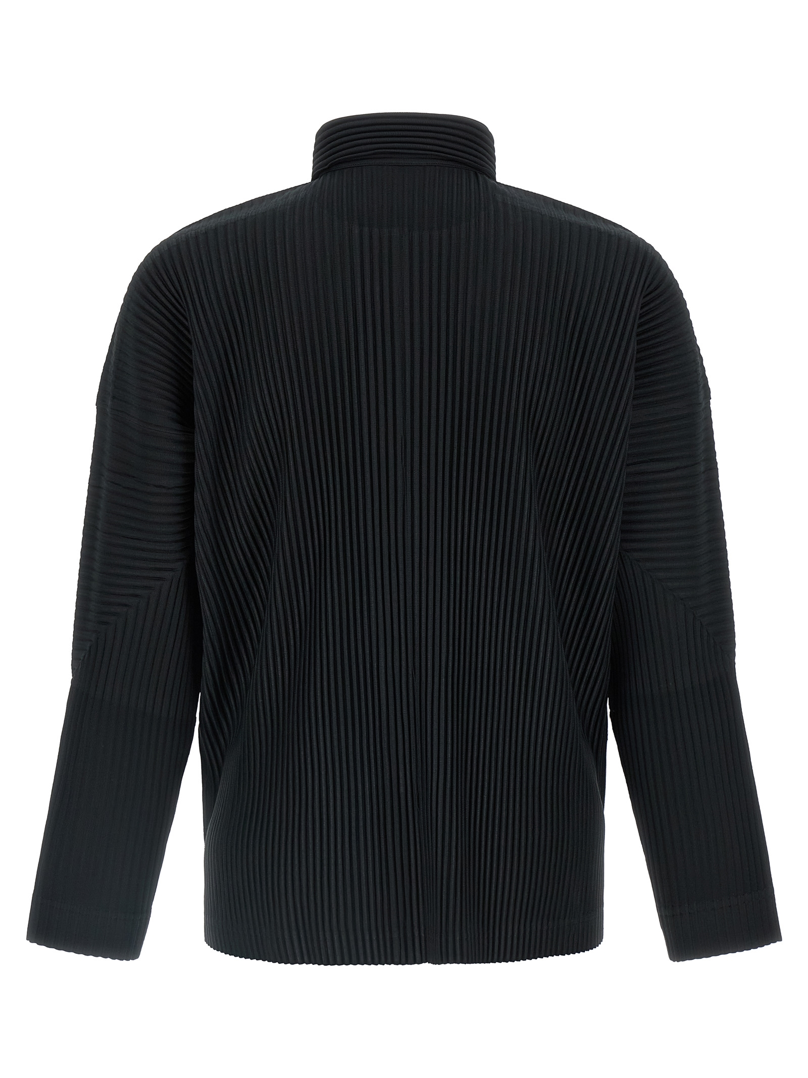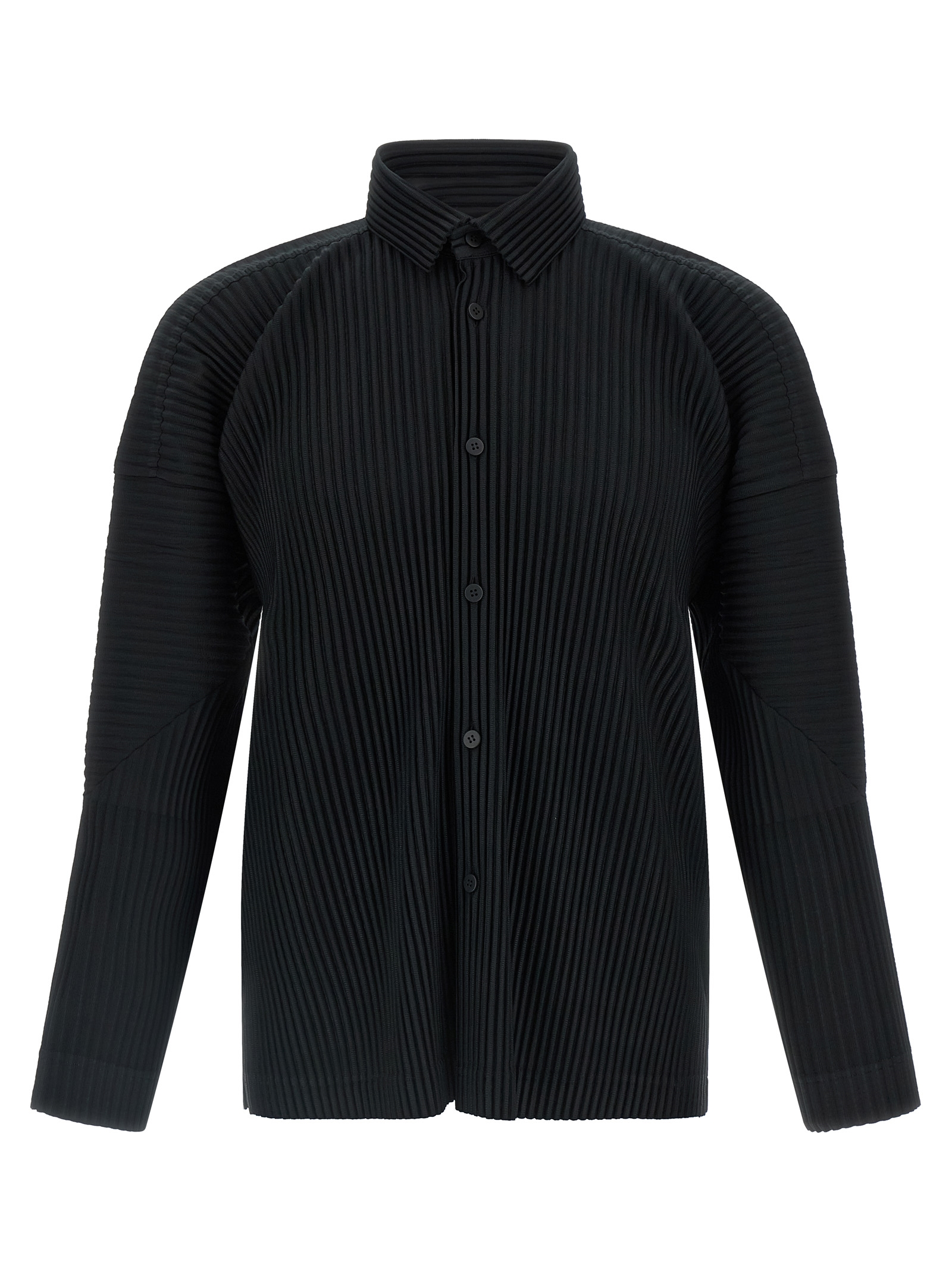 'Monthly Colors: October' pleated fabric shirt, collar, front button closure, long sleeves.