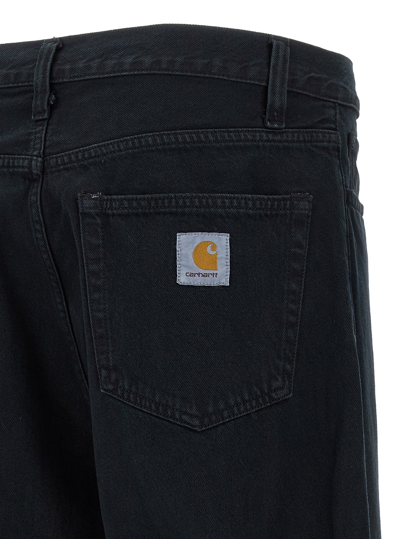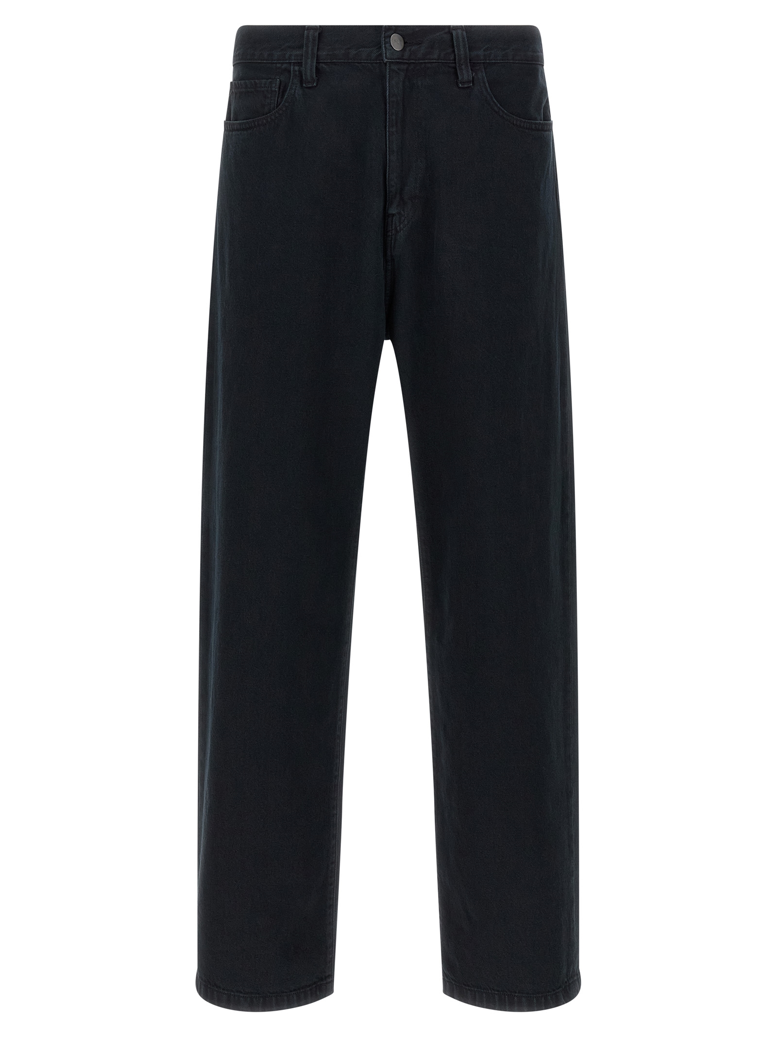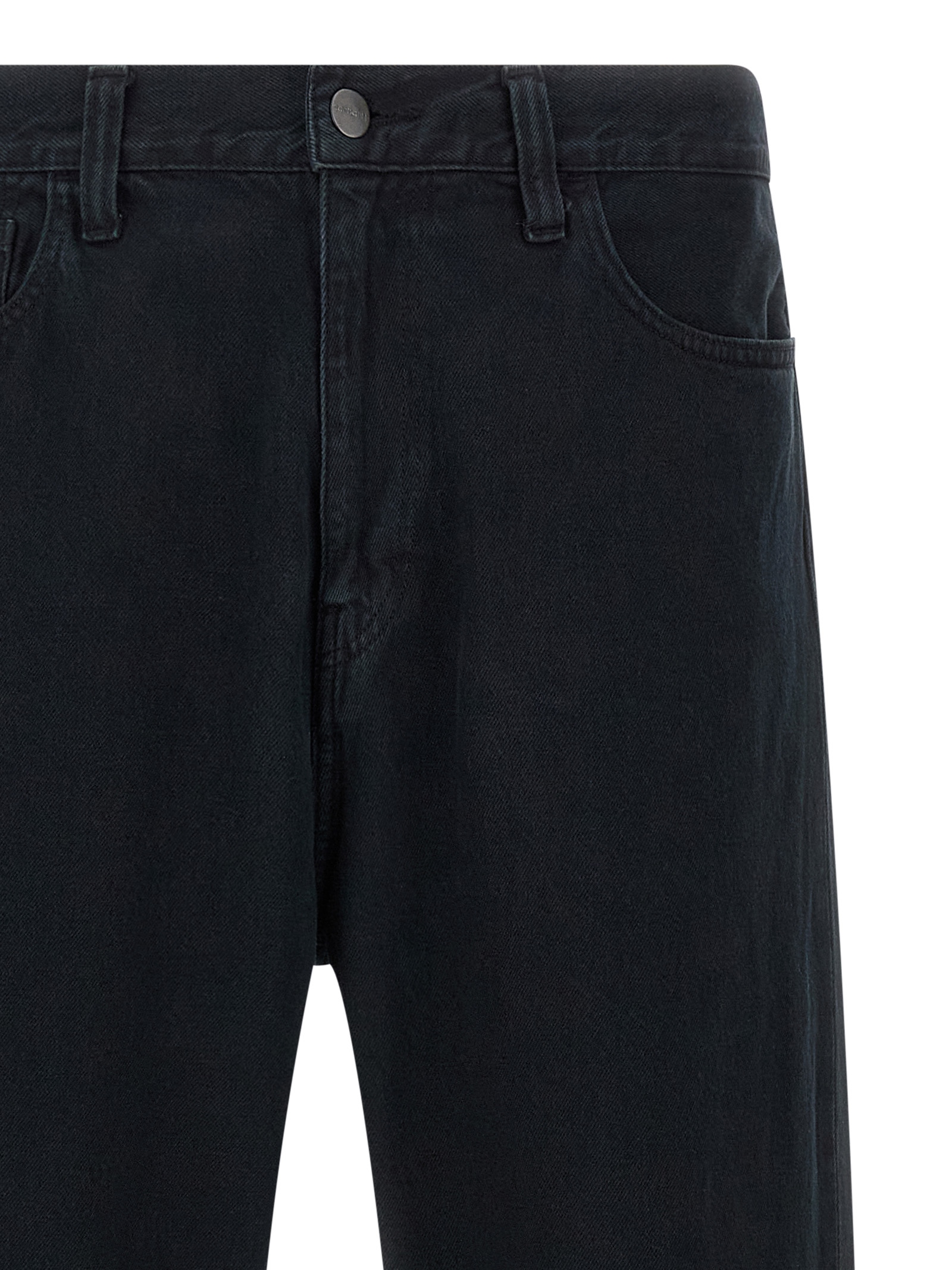 Robertson heavy cotton denim Landon jeans with front zip and button closure, five pockets, straight leg, and back logo patch.