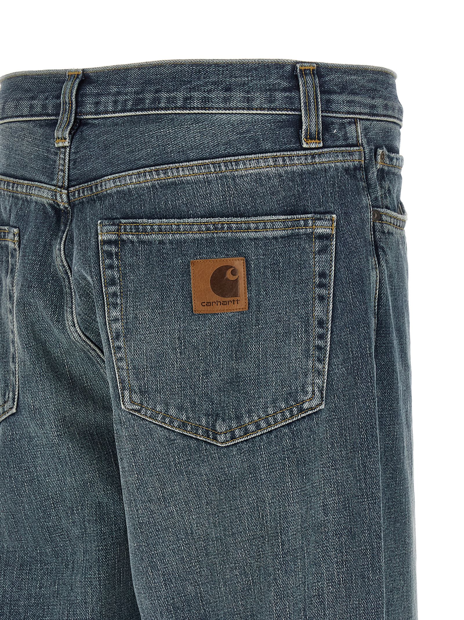 Camano heavy stonewashed cotton denim jeans Aaron with tapered leg, contrast stitching, front zip and button closure, five pockets, and leather logo patch at the back.