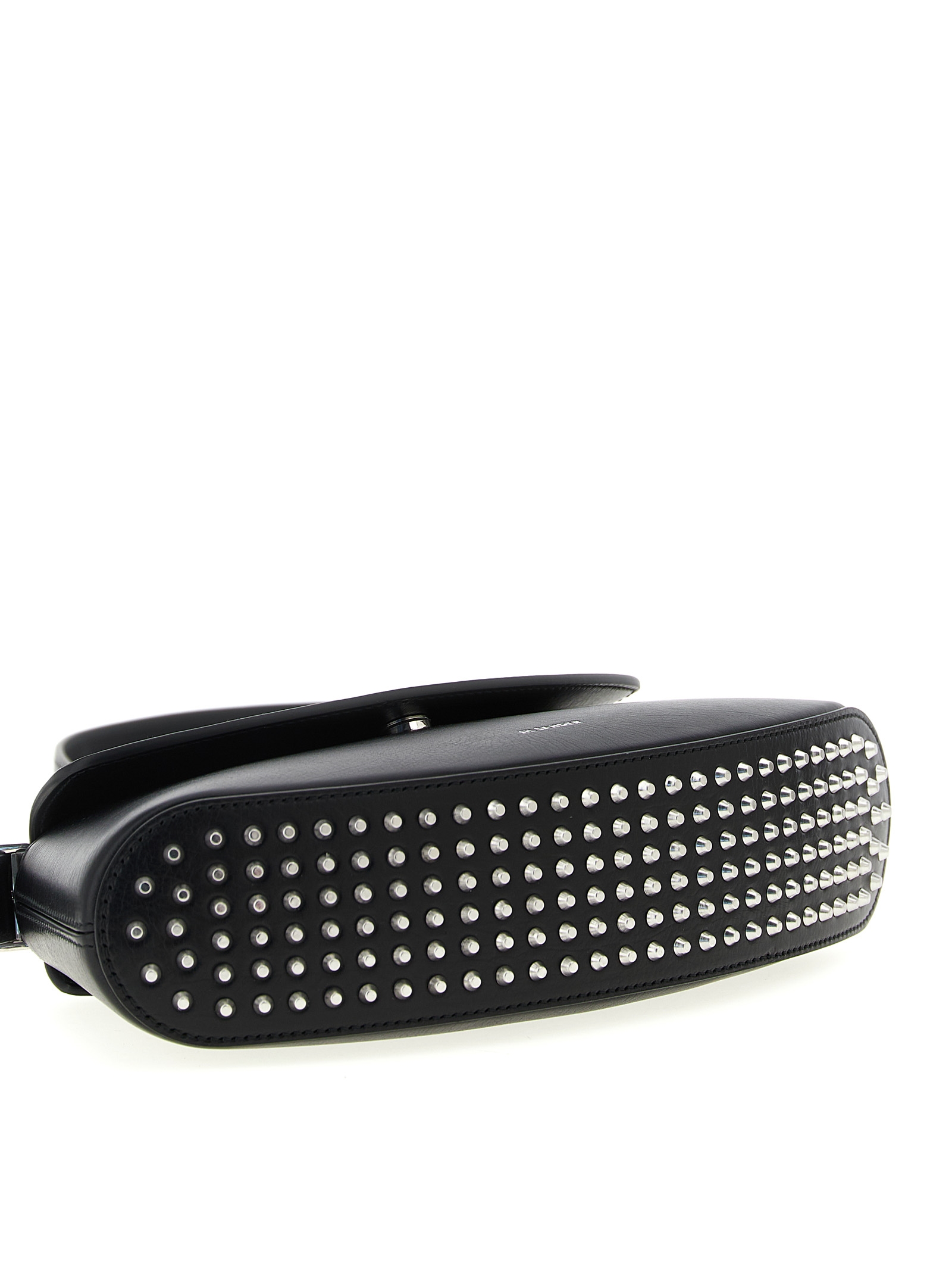 Small leather 'Eldorado' shoulder strap with front embossed logo, curved base with metal stud applications, magnetic flap closure, adjustable handle with metal buckle.