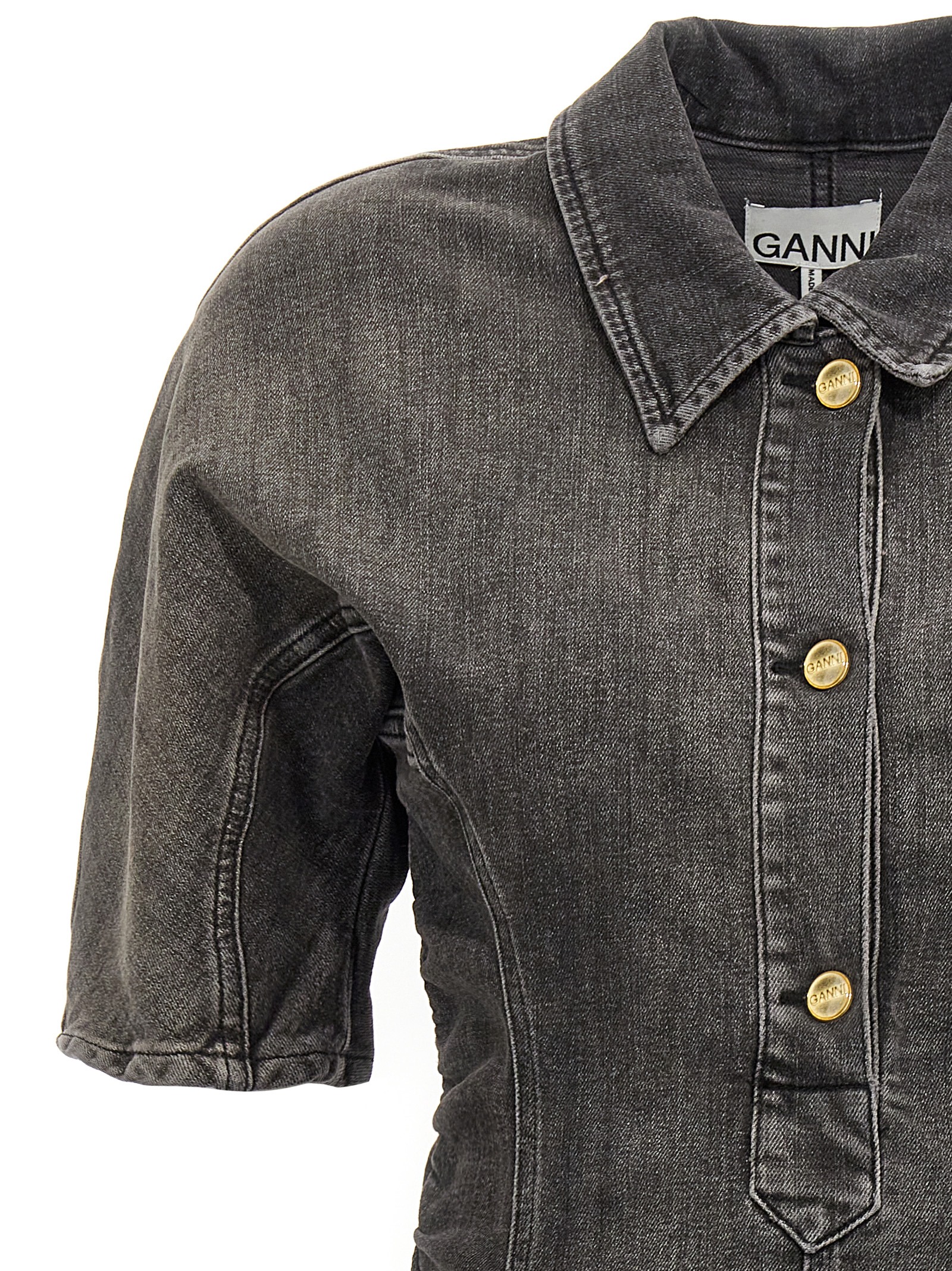 'Tint Edge' dress in stretch cotton denim with button neckline, short sleeves, tight and curled at the waist, frayed flounced hem.