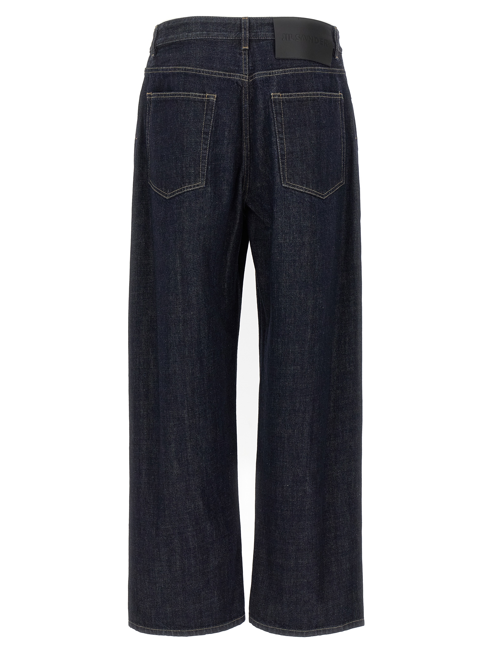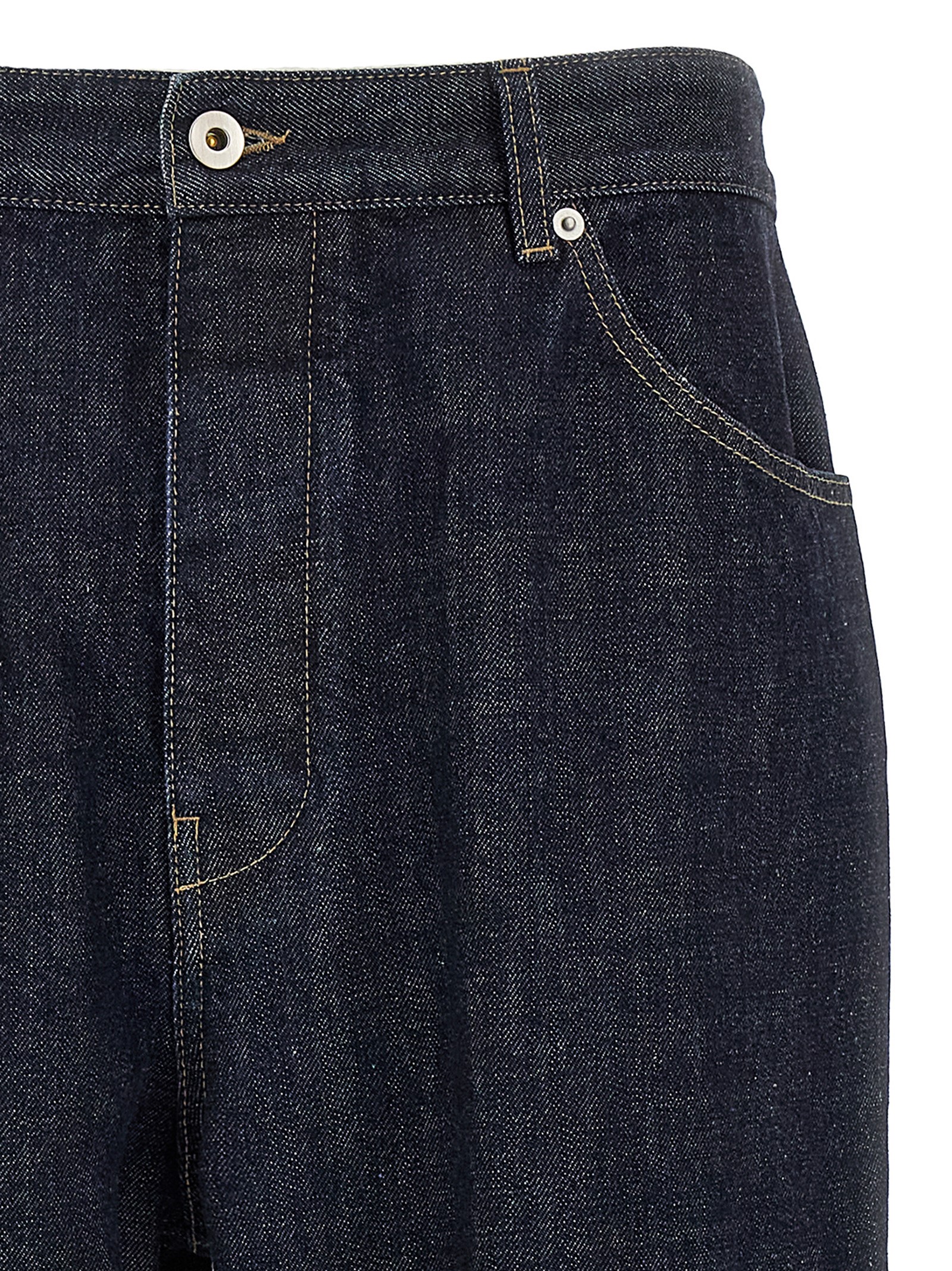 Heavy diagonal cotton denim jeans with contrast stitching, slightly low crotch, wide leg, front button closure, five pockets, and leather logo label at the back.