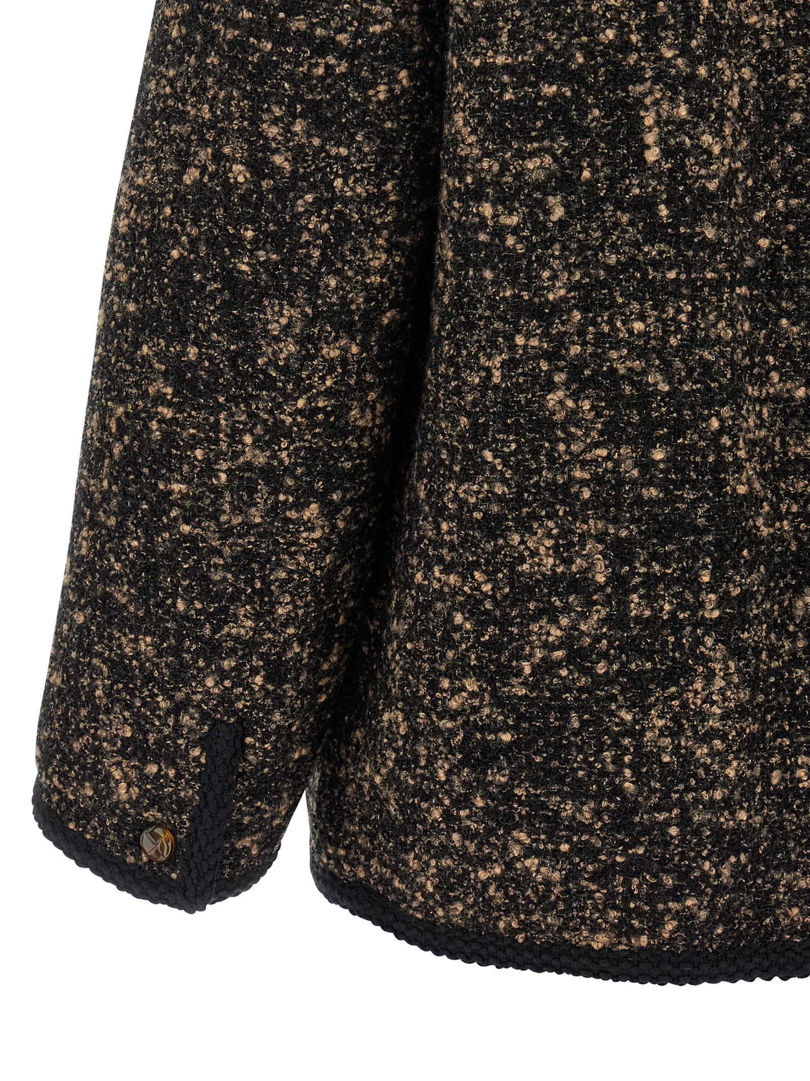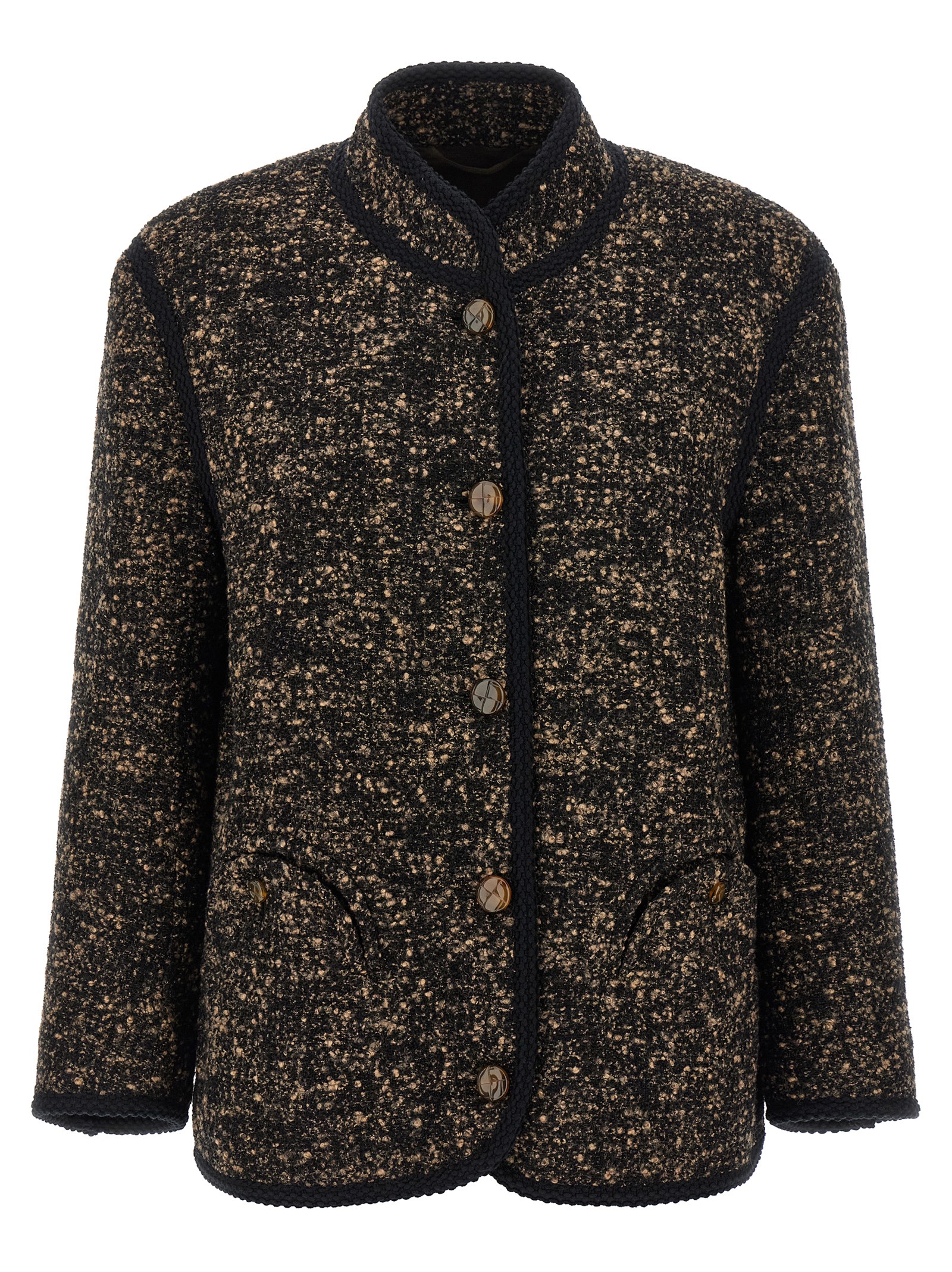 'Katara Curly' bouclè wool blazer with braided wool cord piping, glossy acetate button closure on the front, 'Smiley' pockets, mandarin collar, long sleeves with slightly dropped shoulder straps, monogram viscose lining.