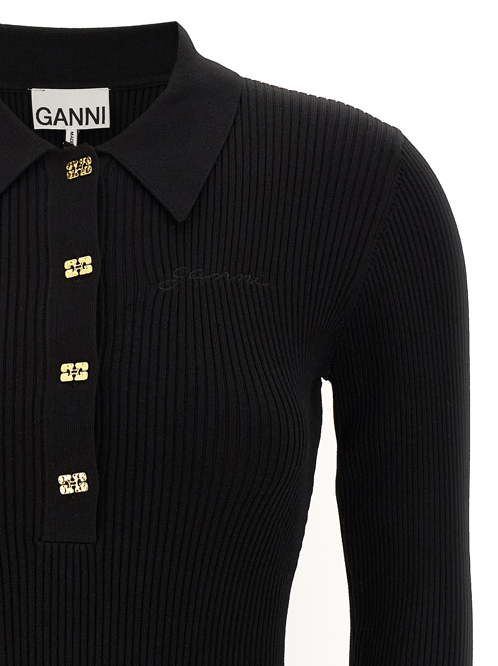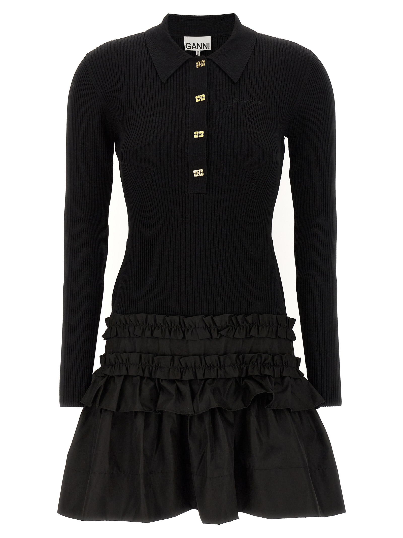 'Melange Rib Knit Mini' dress consisting of a ribbed stretch viscose top, polo style, tone-on-tone logo embroidery on the front, collar and buttons, long sleeves and a flounced mini skirt in technical fabric.
