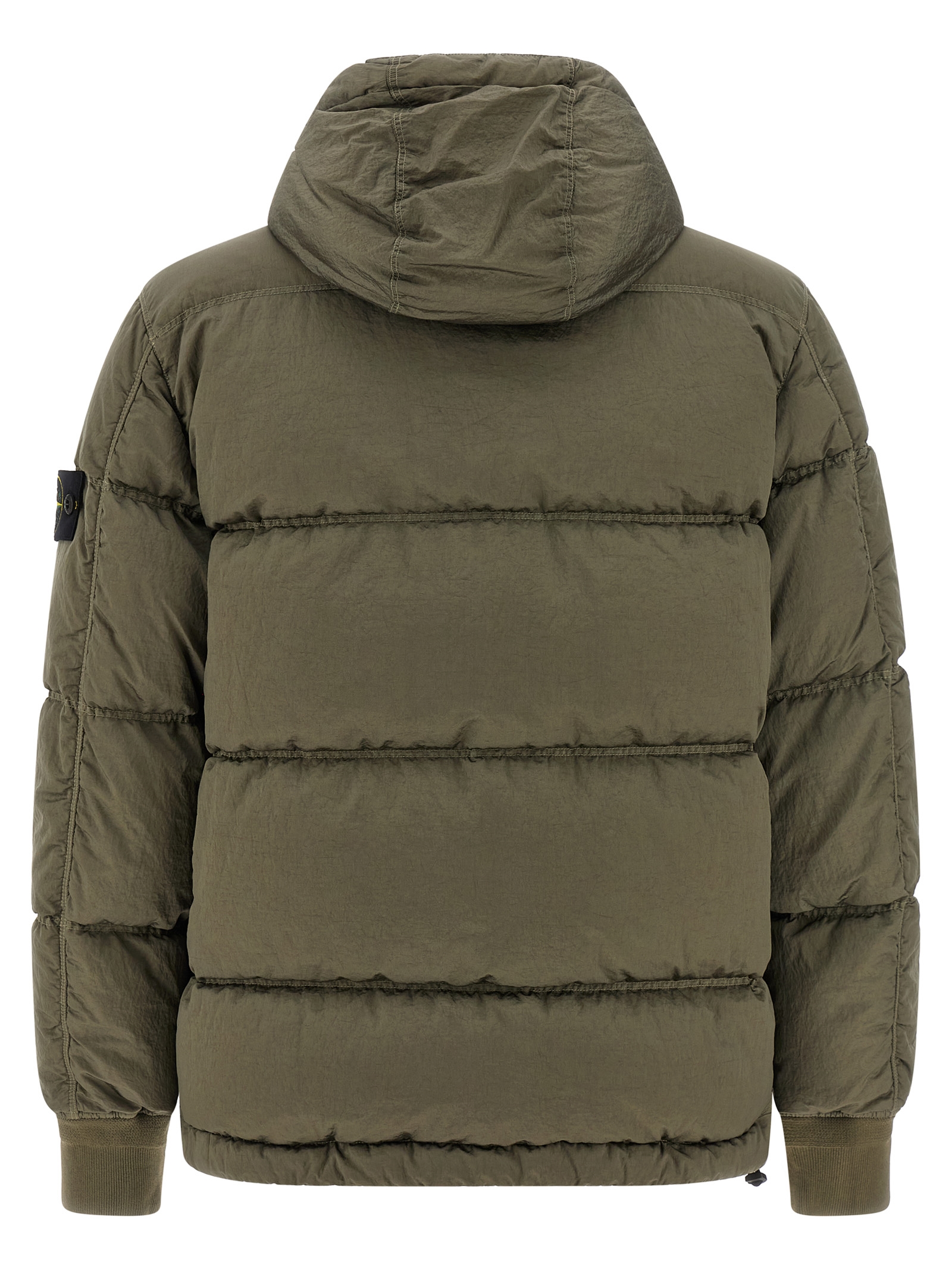 Quilted iridescent Nylon Metal quilted down jacket with goose feather padding, adjustable hood, front zip closure, pockets, long sleeves with knitted cuffs and logo badge appliqué, drawstring on the hem. SUSTAINABLE: This product is made of ECONYL regenerated nylon.®Өнімнің ерекшеліктері