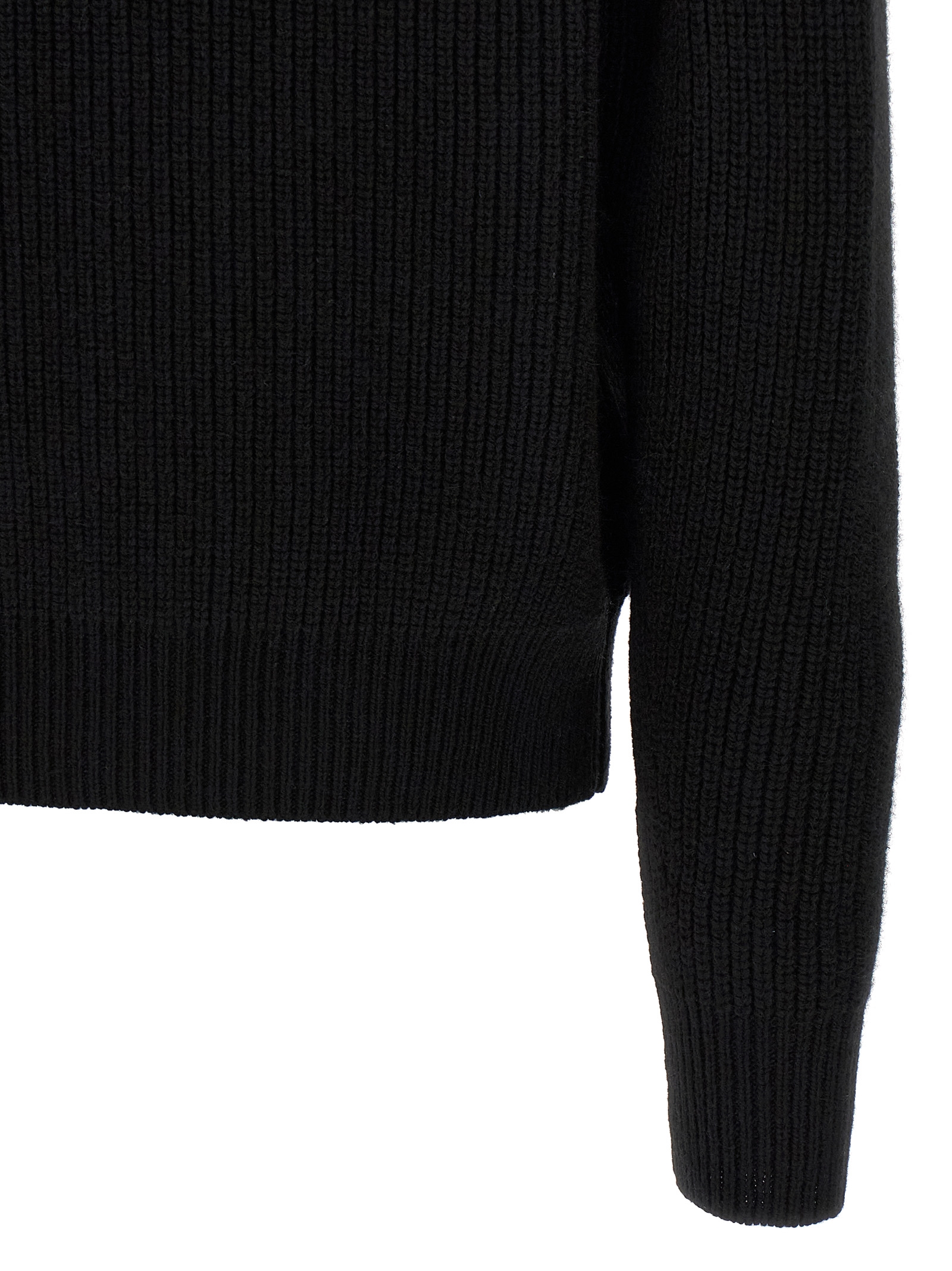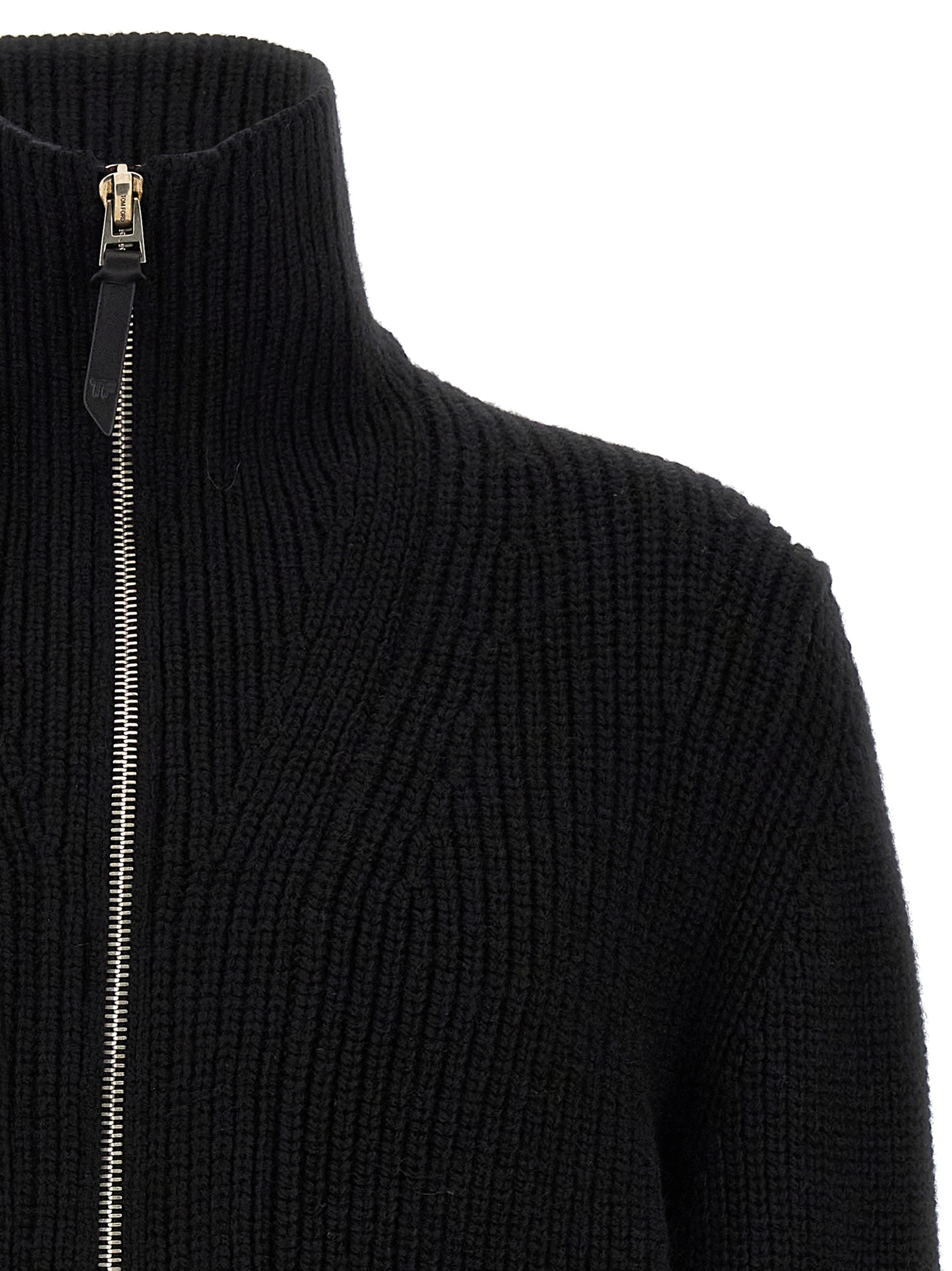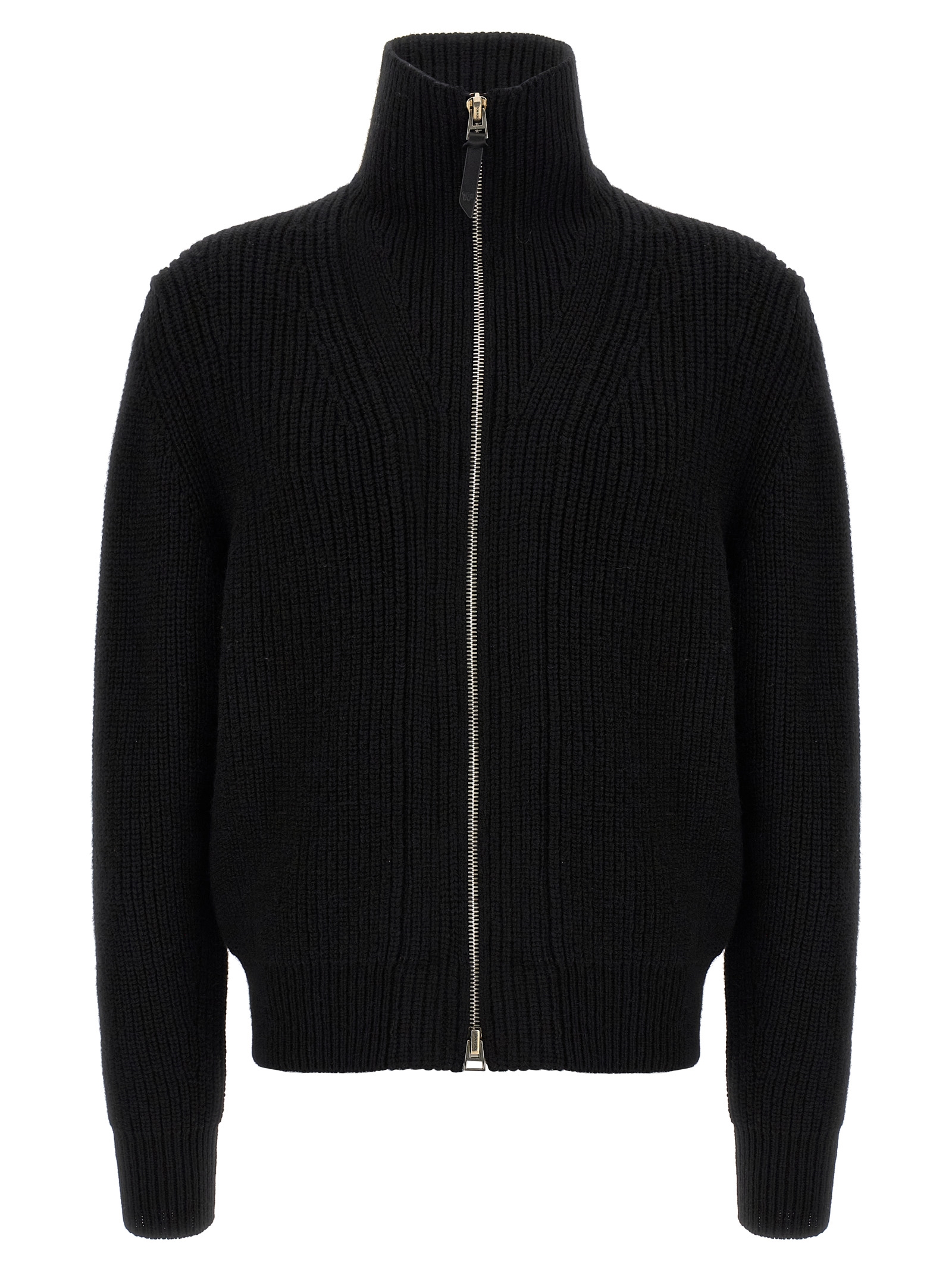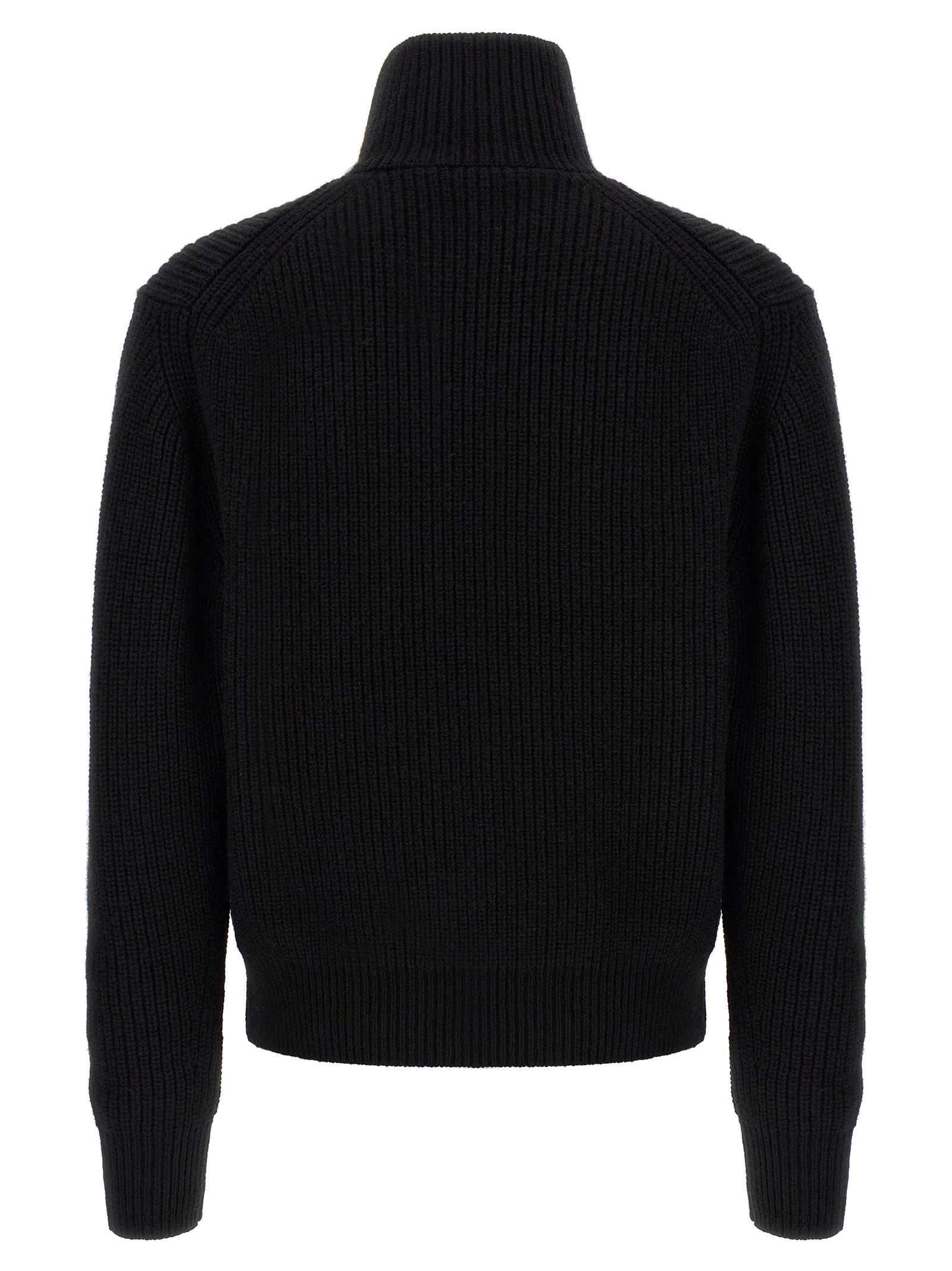 Mohair blend sweater with double tie rod zip closure, maxi rib knit, high neck, long cuffed sleeves.