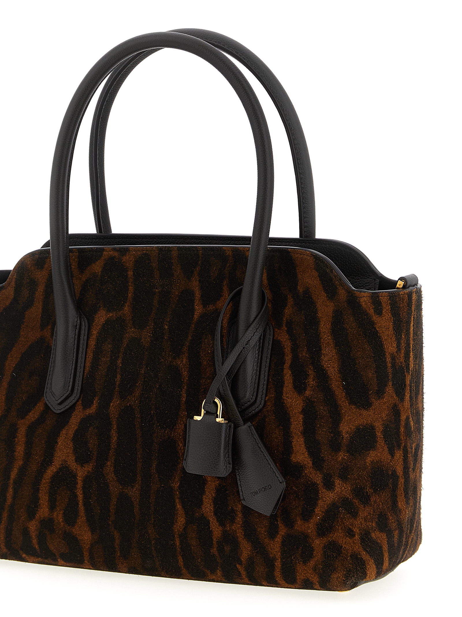 'Ocelot' animal print suede handbag with leather details, double fixed handle, top zip closure, adjustable and removable shoulder strap.