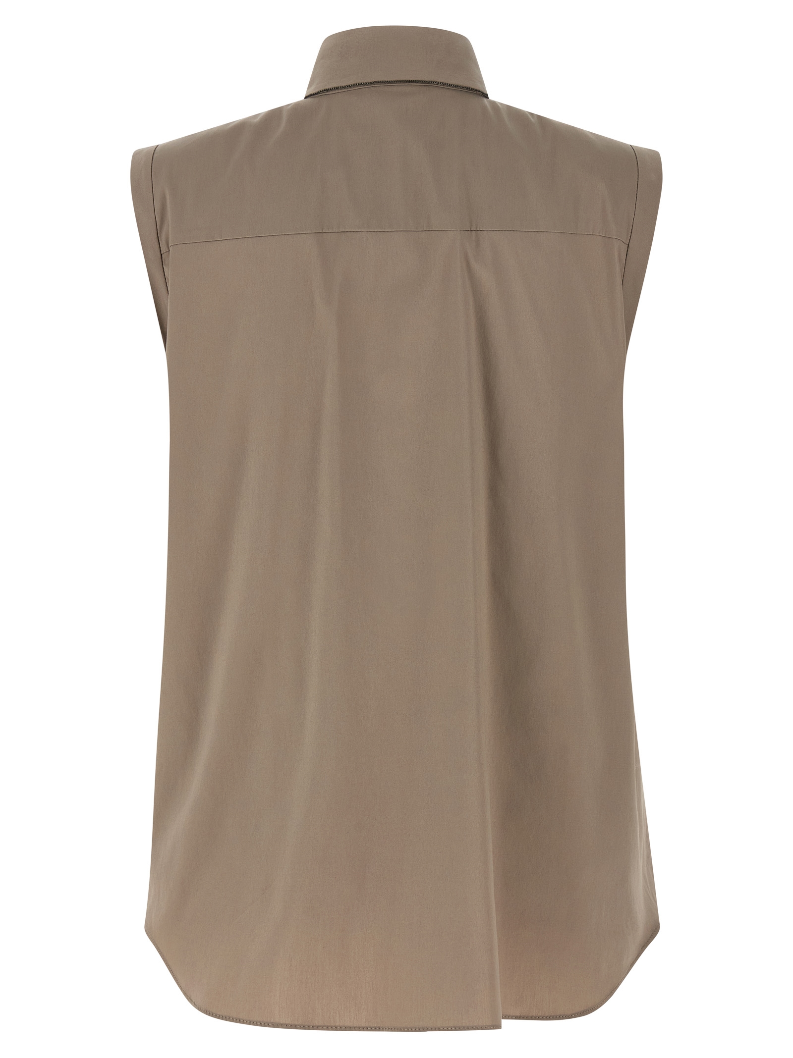 Classic cotton poplin shirt with Monile detail in the collar, front closure with hidden buttons, sleeveless.