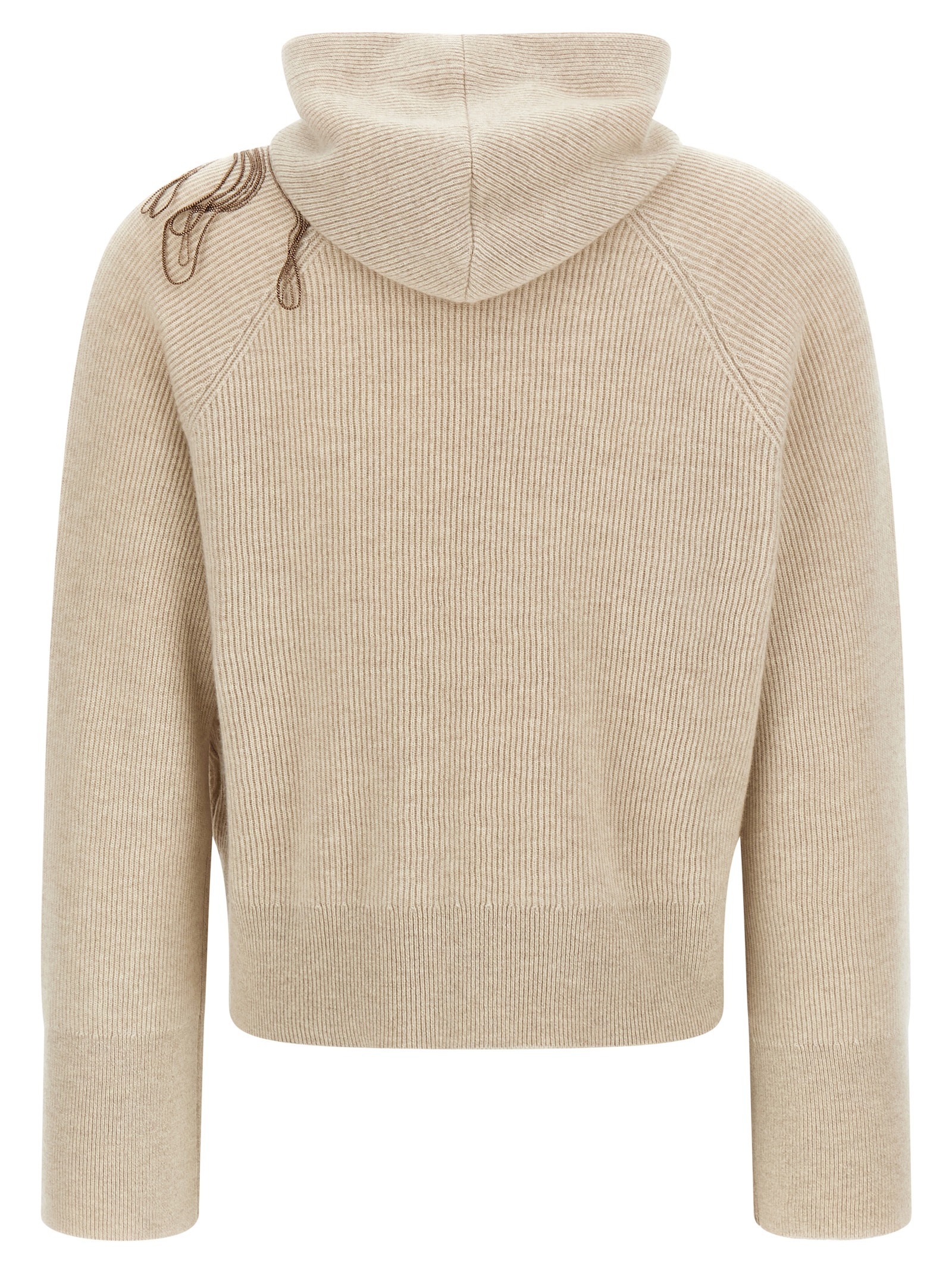 English ribbed cashmere hooded sweater with 'Shiny Flower Embroidery' embroidery with thin jewel threads on the front, long sleeves with dropped shoulders.