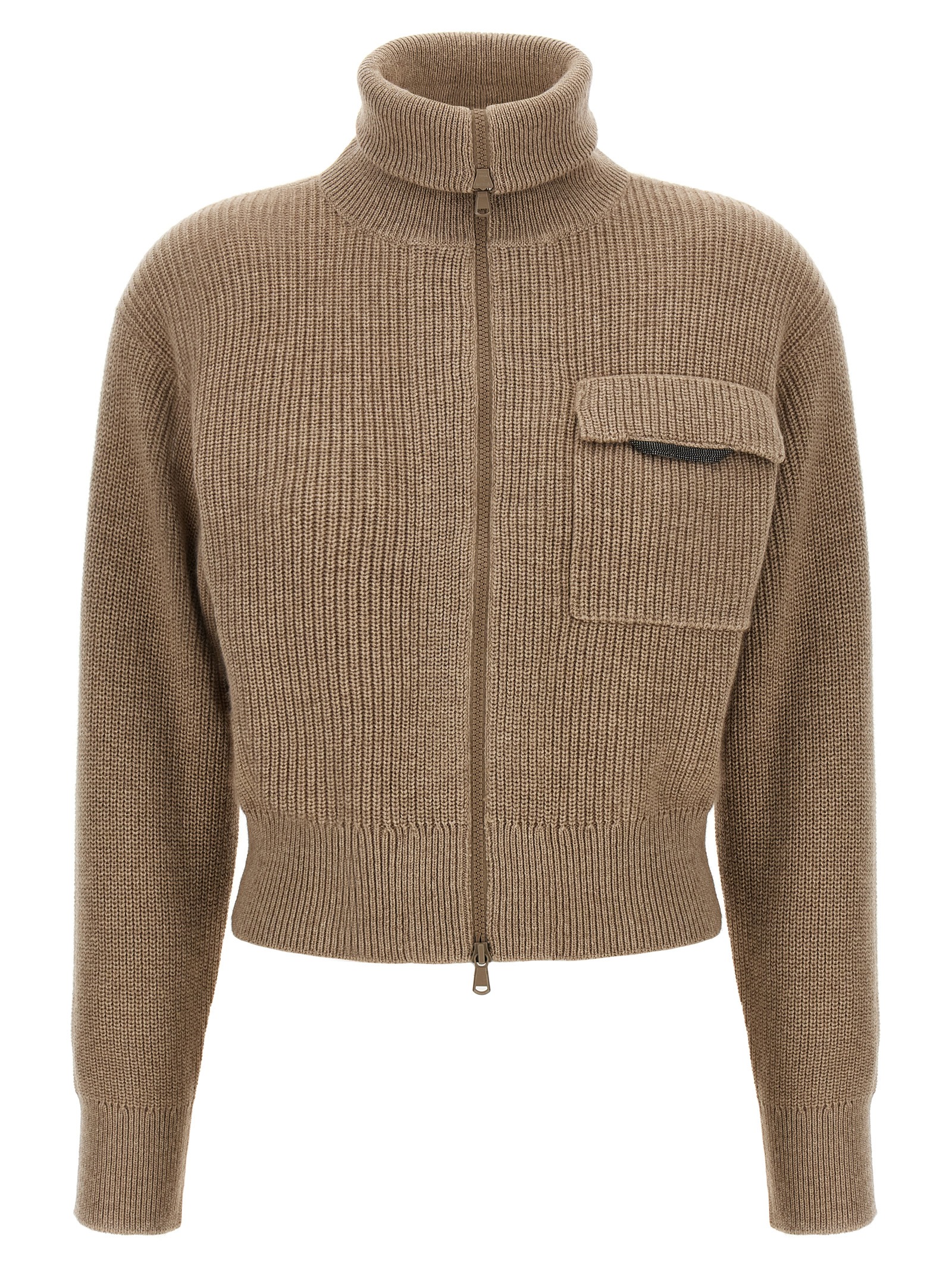 Cashmere cardigan worked in cropped sweater, high neck, front zip closure, breast pocket with Monile 'Shiny Flap Detail' and long cuffed sleeves.Өнімнің ерекшеліктері