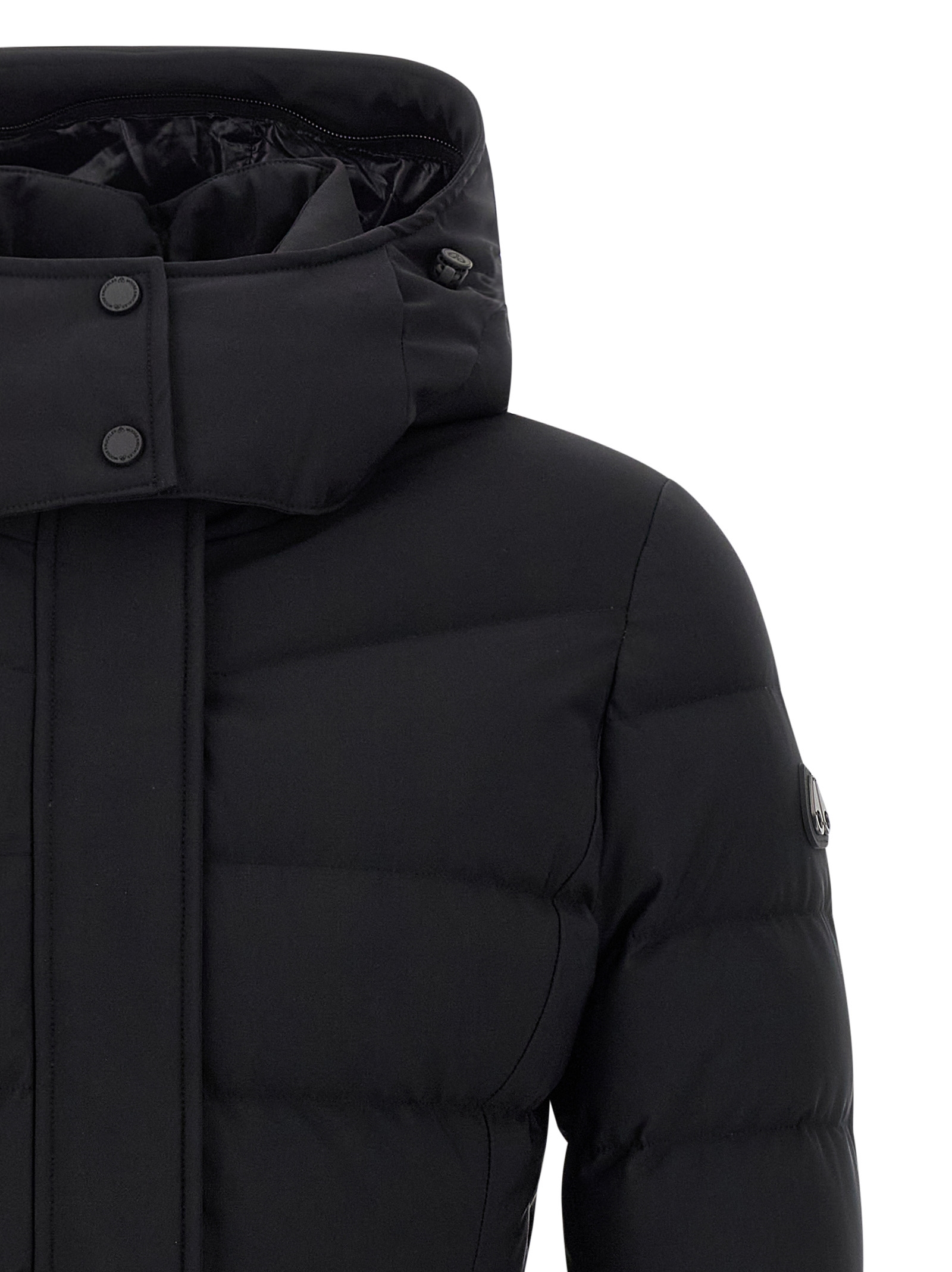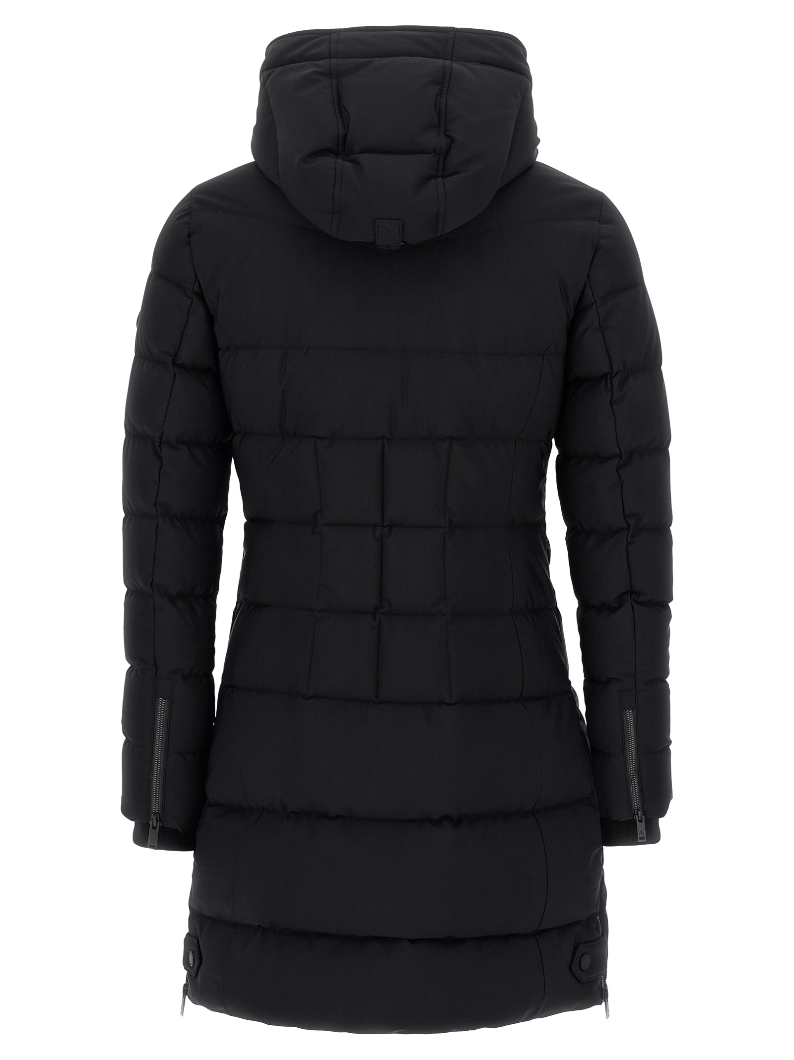 Padded and quilted 'Watershed 3 Parka' jacket, removable hood with zip for finishing change, high neck, front hooded closure, side logo patch, knee length with side zip slits, long sleeves with zip on the bottom and knitted cuffs.