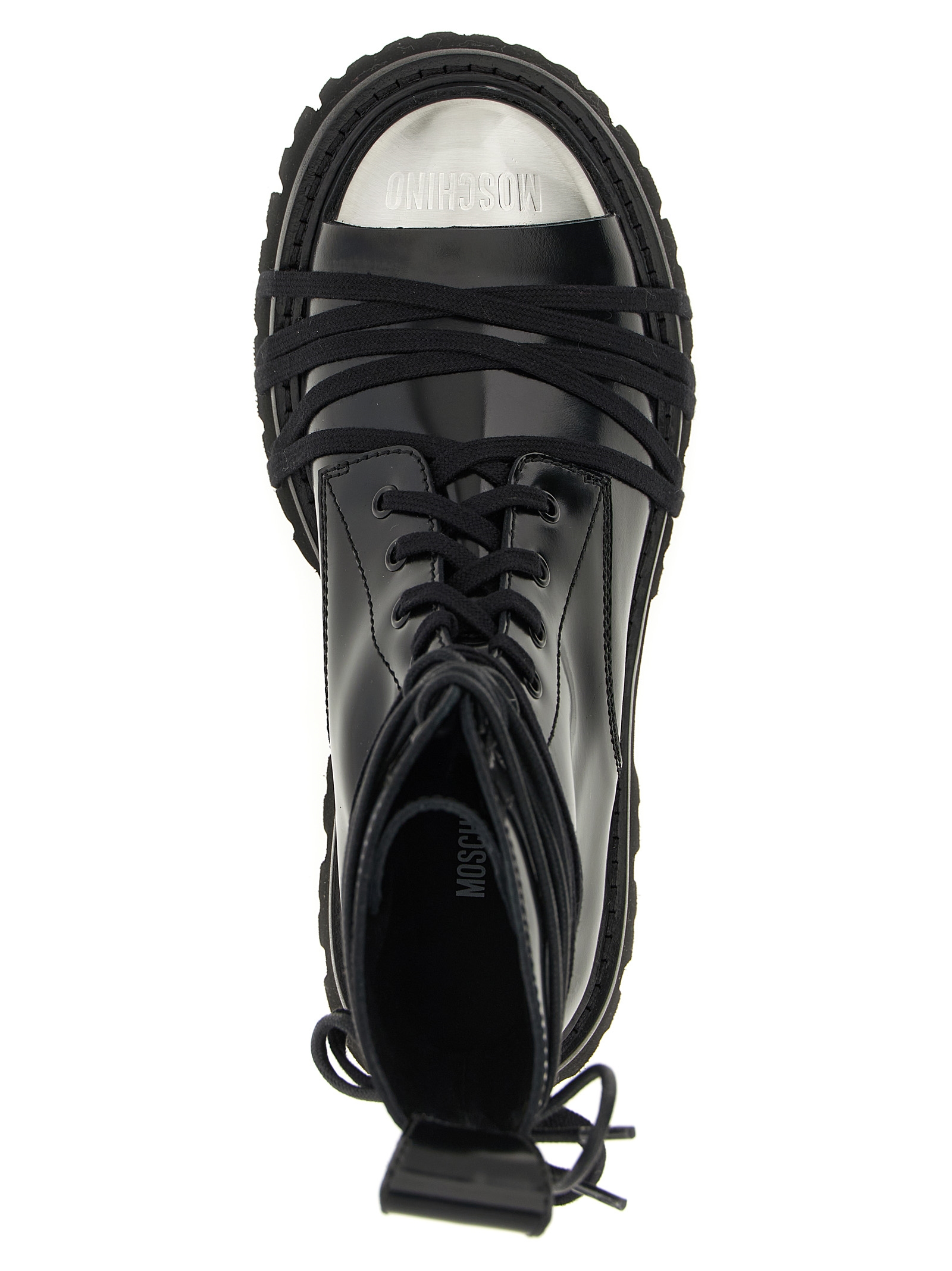 'Combat' calf leather combat boots with rounded toe cap with metal detail with engraved logo, laces and rubber sole.