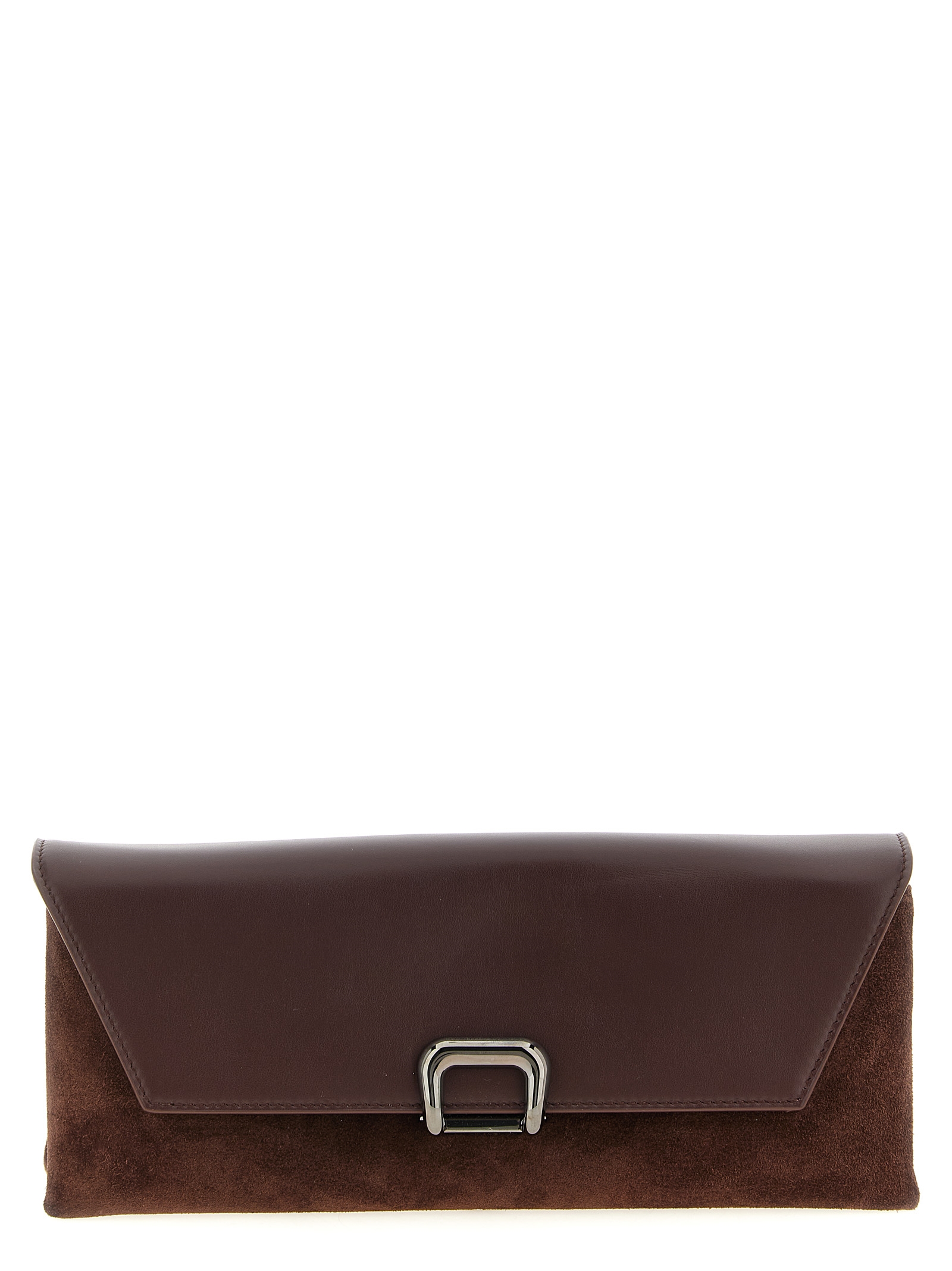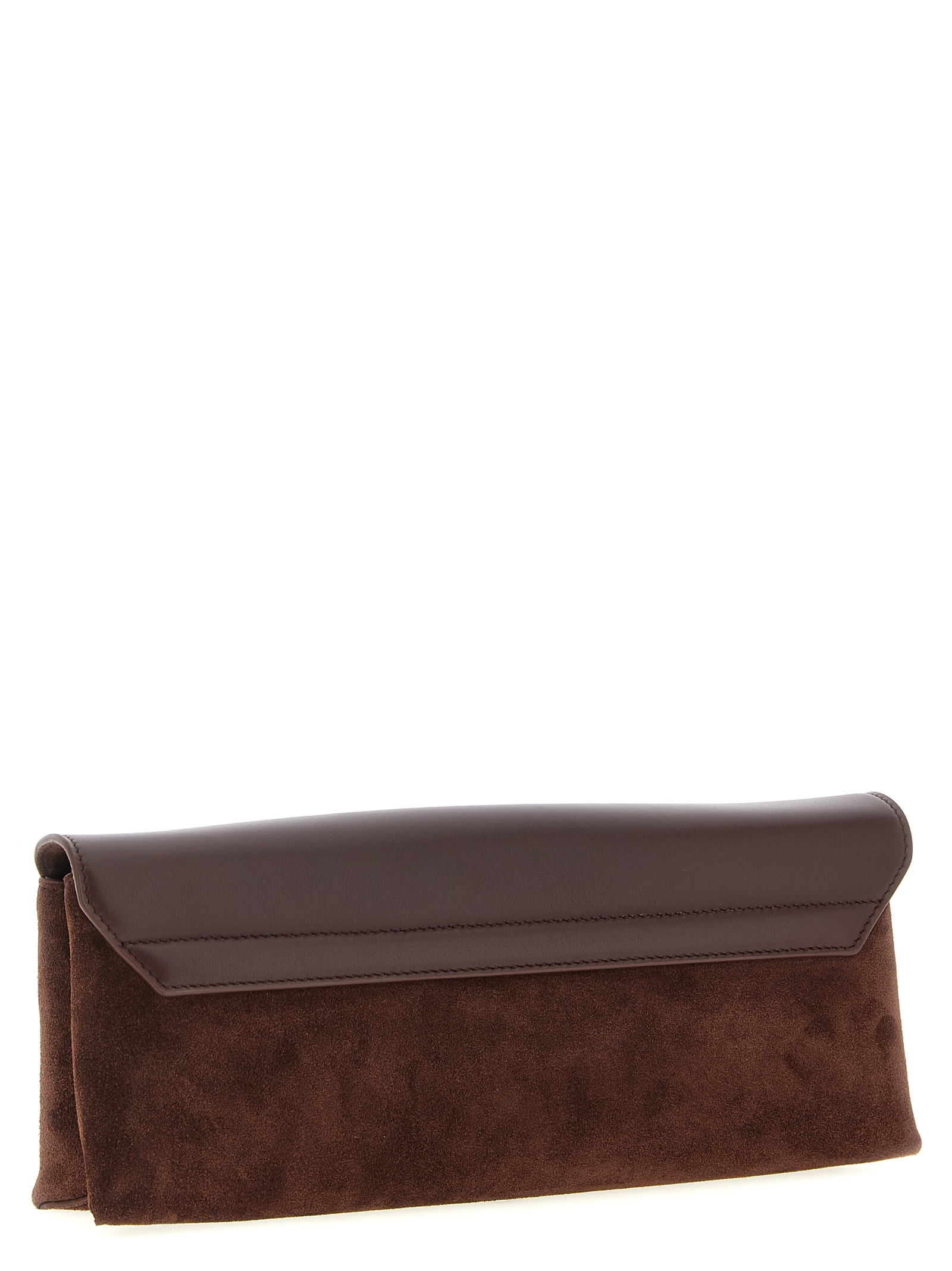 'Sartorial' suede pouch, smooth calf leather flap closure with magnet and foldable metal buckle, leather lining.