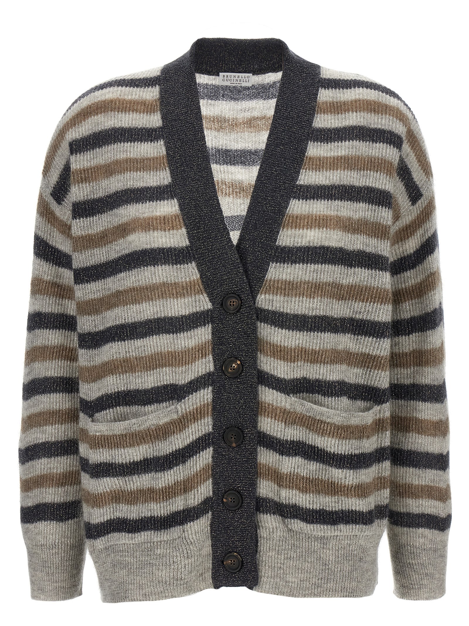 Striped wool blend cardigan with lurex threads, V-neck, front button closure, pockets, long sleeves with cuffs and dropped shoulders.Өнімнің ерекшеліктері