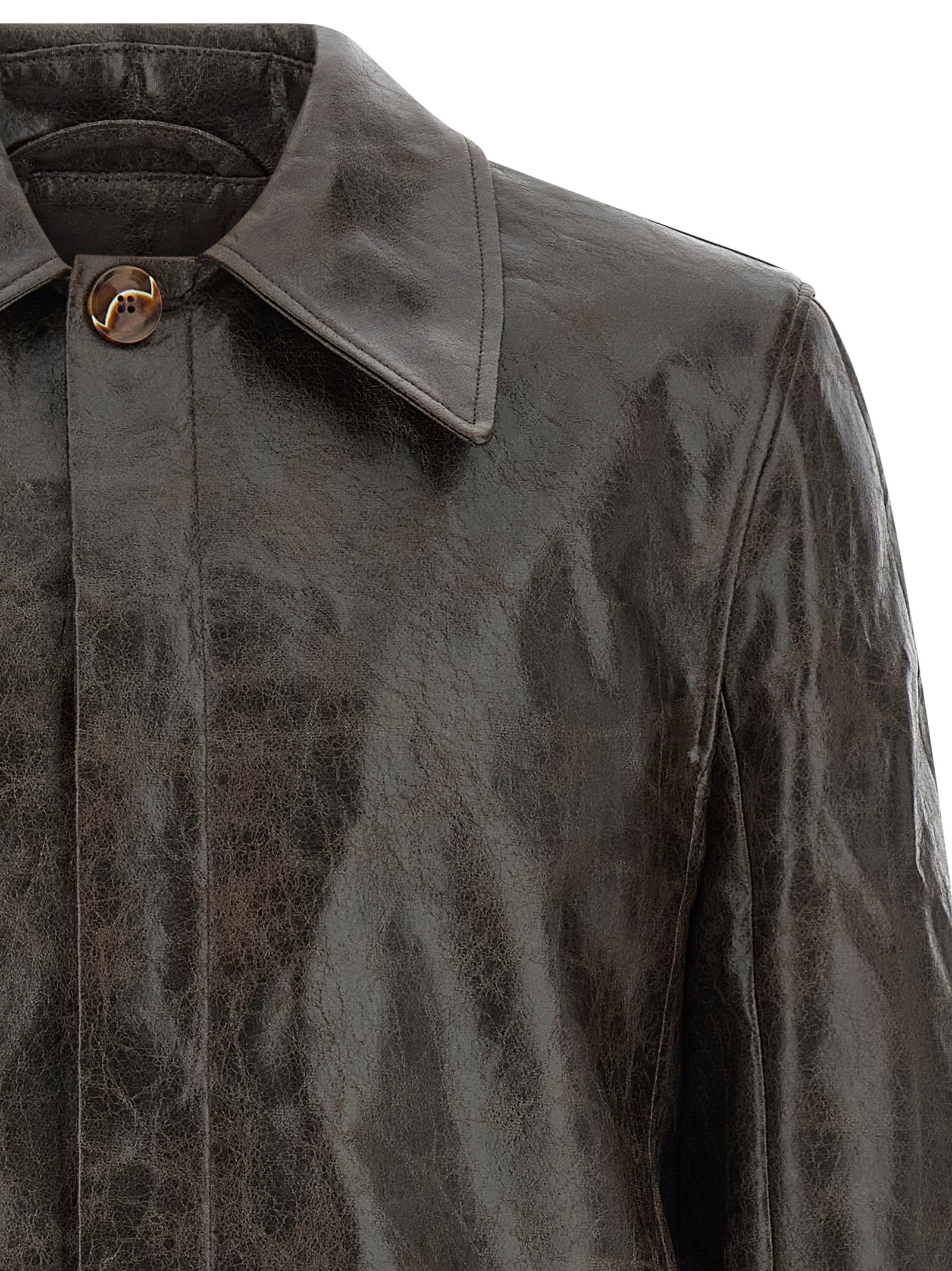 'Keane' jacket in craquelé leather-effect coated polyester, wide shirt collar, concealed front button closure, slightly padded shoulder strap, long flared sleeves with slit on the cuffs, viscose lining.
