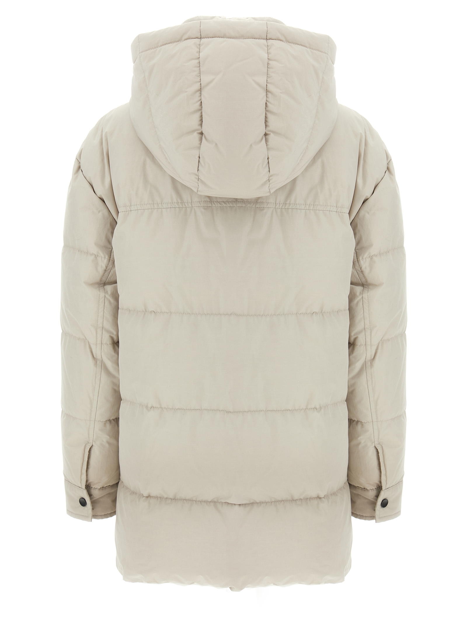 Quilted padded tech fabric down jacket, removable hood, high neck with crochet knit insert, front zip and snap button closure, pockets, long cuffed sleeves, side slits with zip closure.