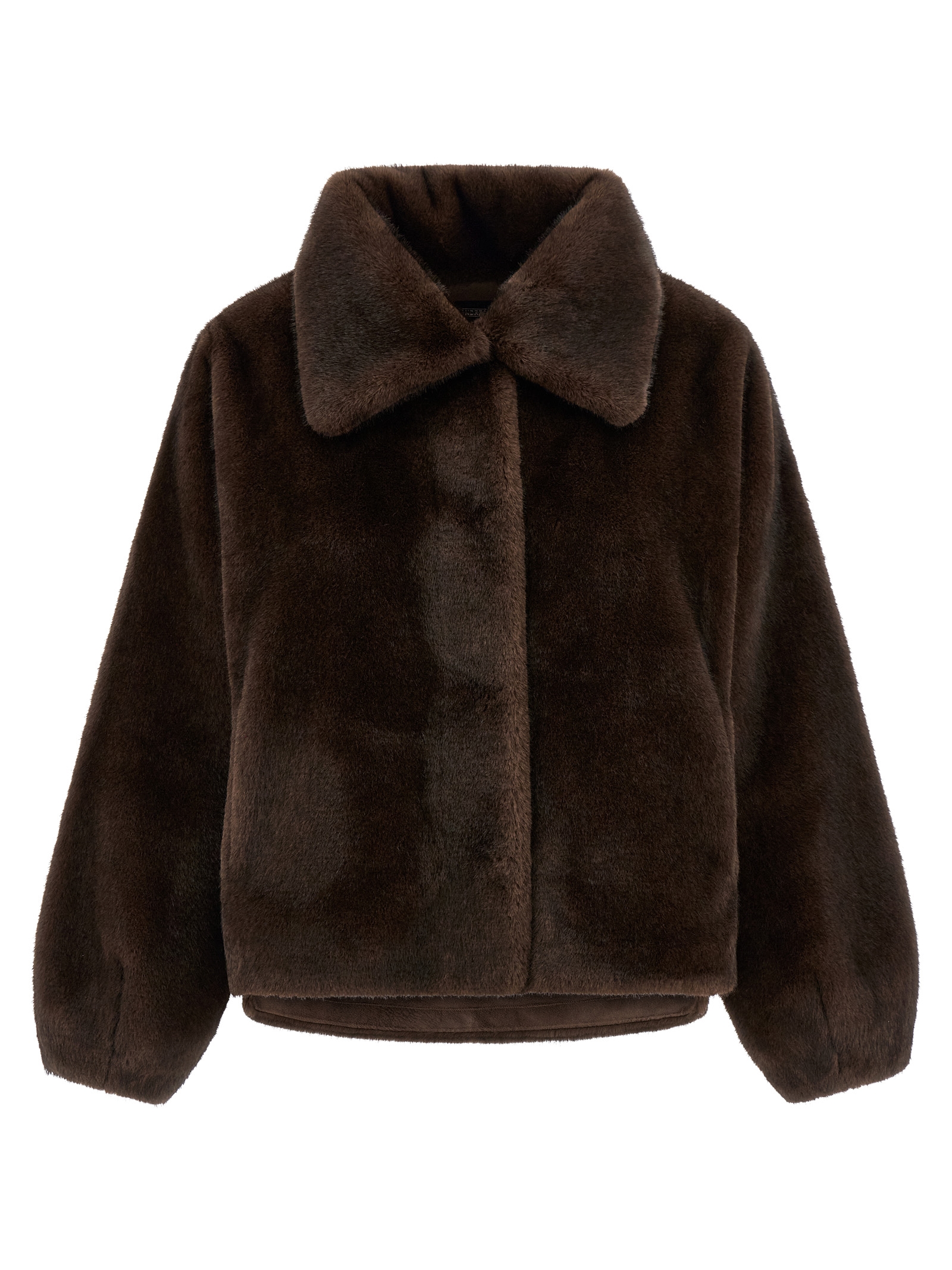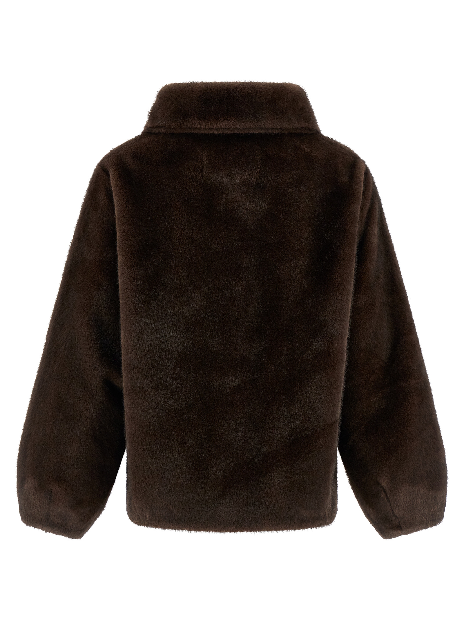 Mink effect faux fur, shirt collar, front snap button closure, pockets, long sleeves, side slits, asymmetrical hem, unlined.