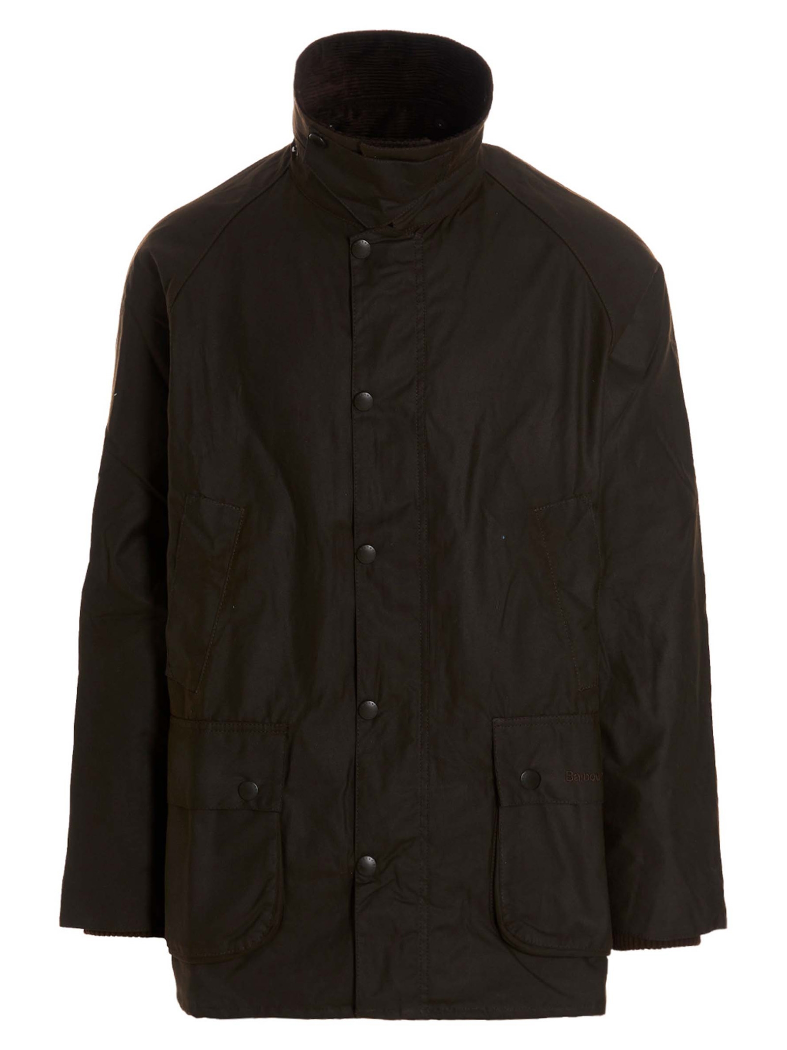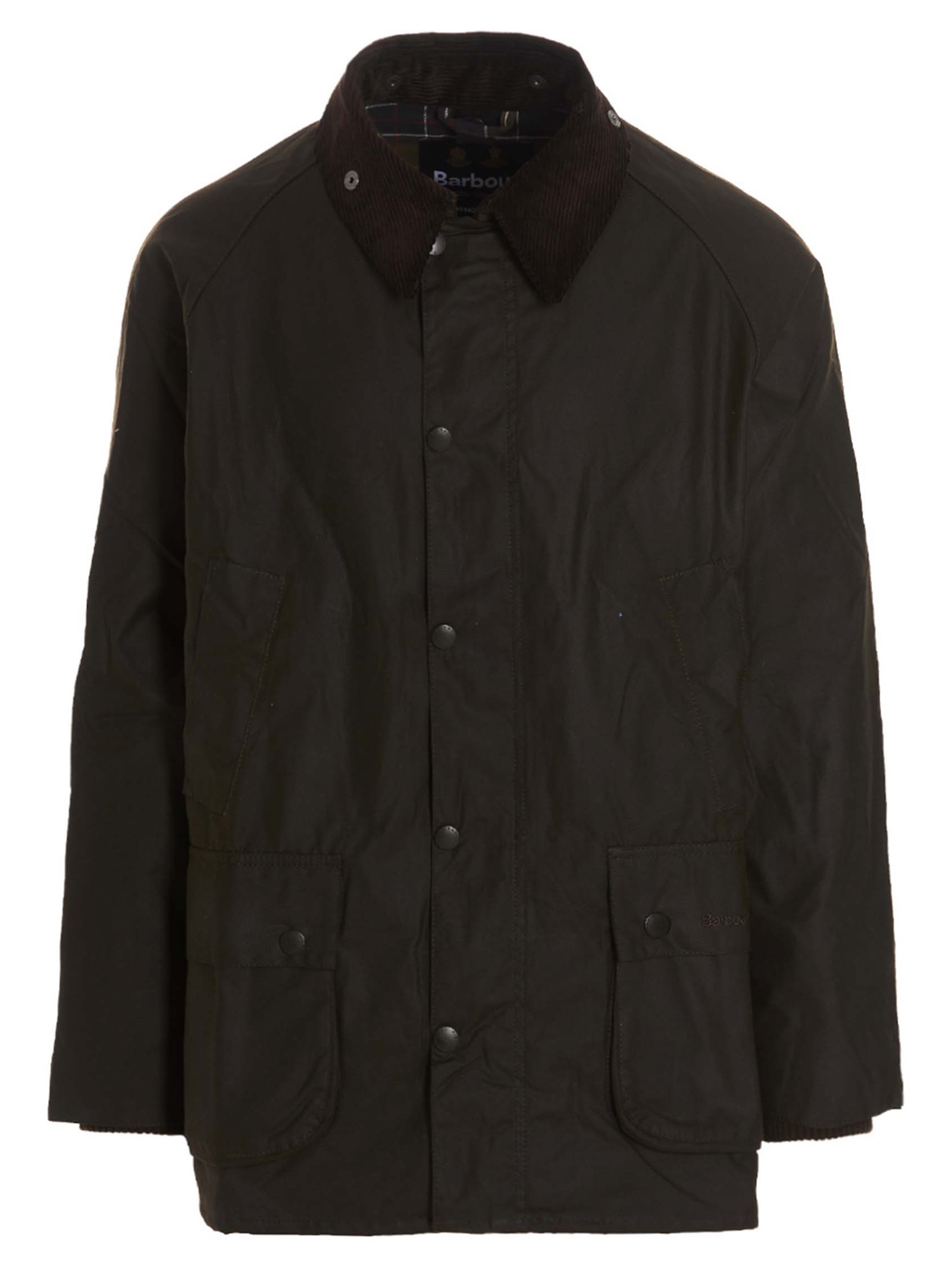 'Bedale' waxed cotton jacket with zip and button closure, pockets, corduroy collar, and long sleeves.