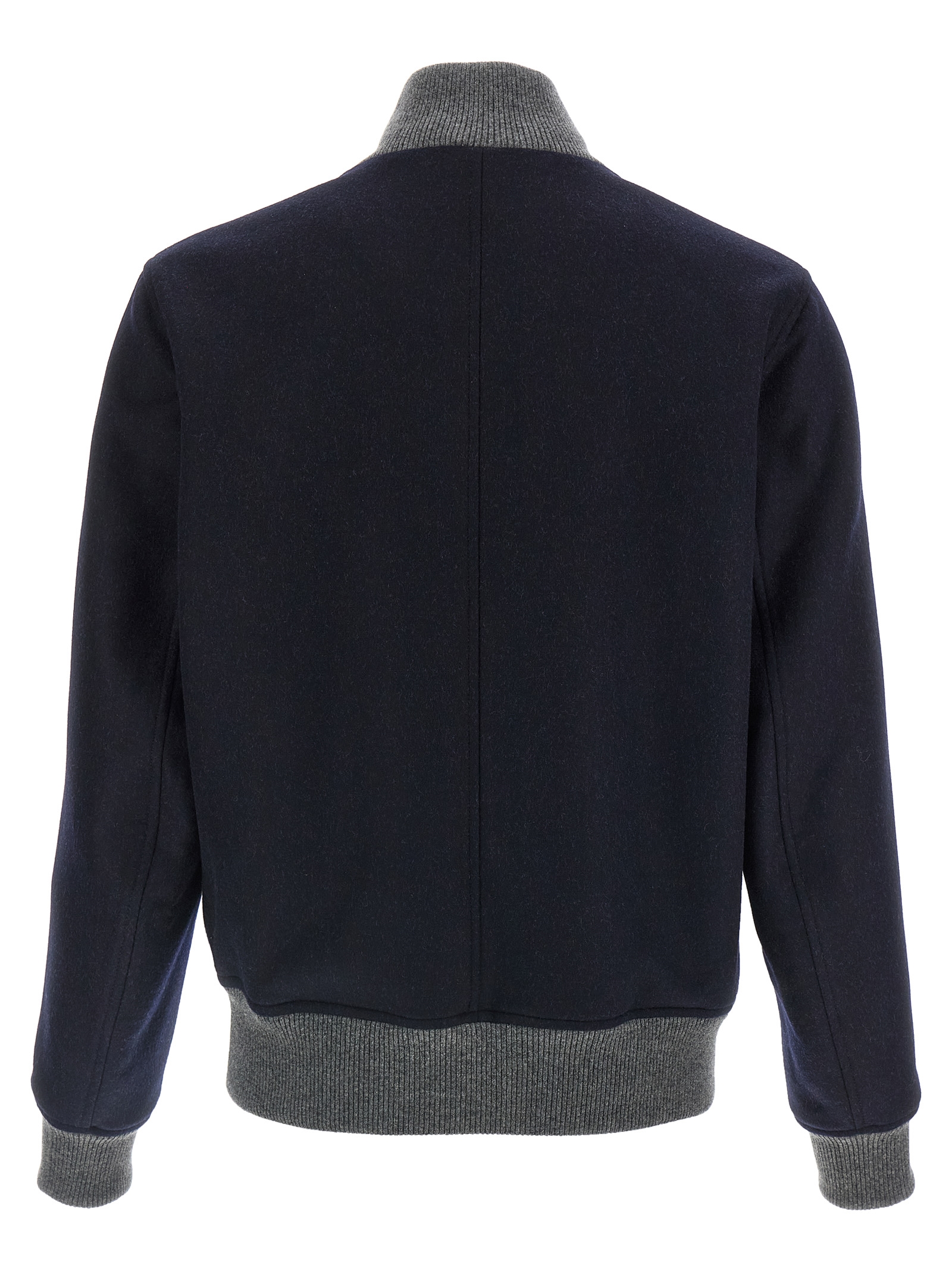 Wool bomber jacket with contrasting stretch ribbed knit details, high neck, front button closure, pockets, long cuffed sleeves, cupro lining.Өнімнің ерекшеліктері