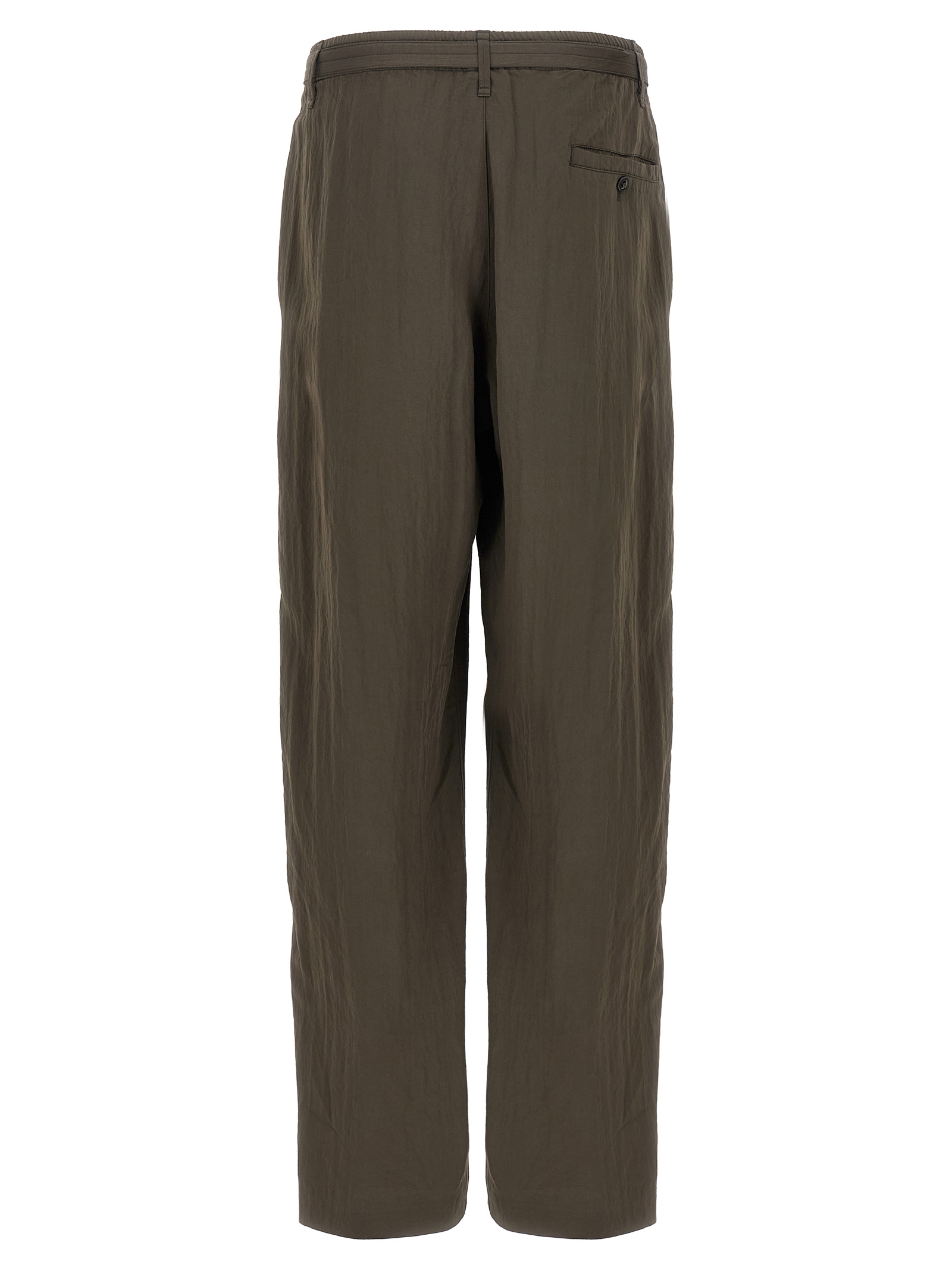 Viscose trousers, slightly dropped crotch, straight leg with front pleats, adjustable elastic waistband with belt and buckle, pockets.