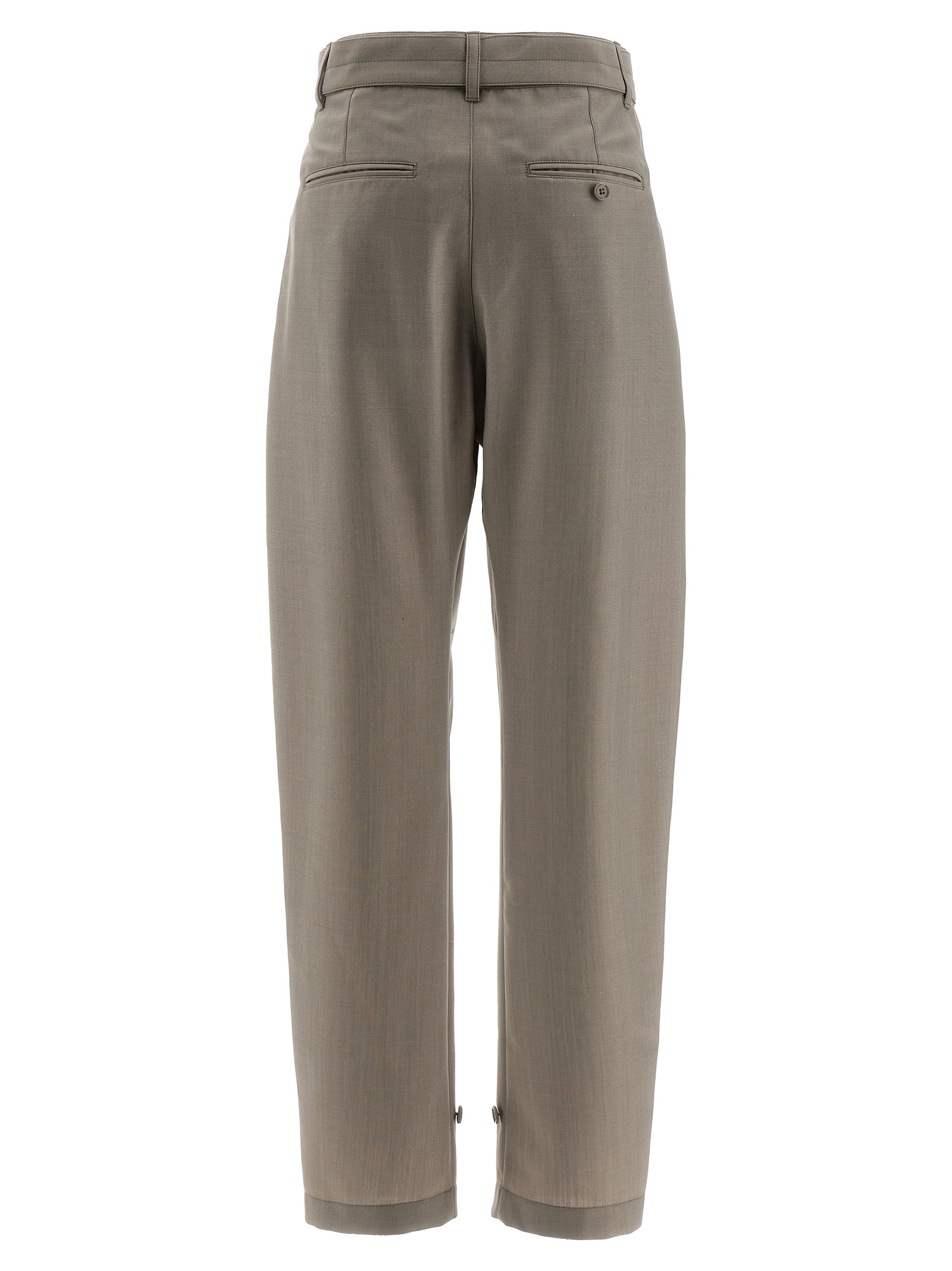 Curved Tailored' straight pants in wool, belt loops at the waist with adjustable belt with buckle, zip, hook and button closure, pockets, adjustable tape with button on the cuffs.