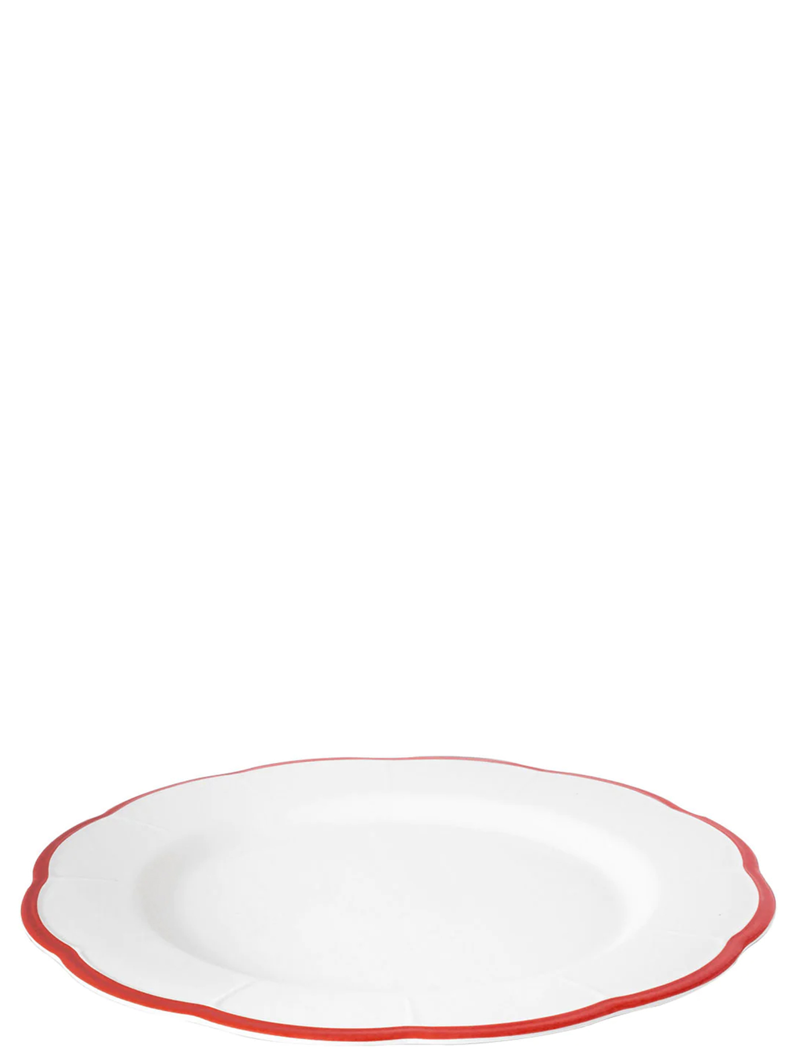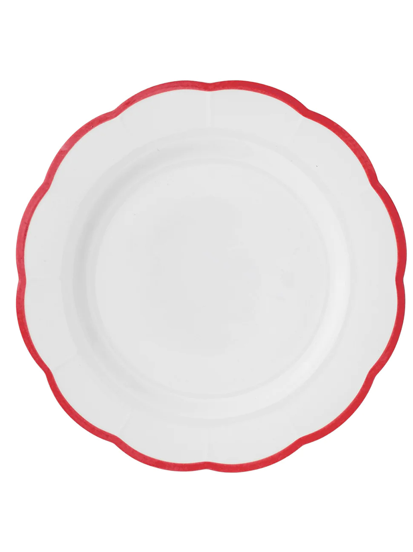 'Petalo' dinner plate, white ironstone material with red scalloped edge. Suitable for dishwasher, suitable for microwave.