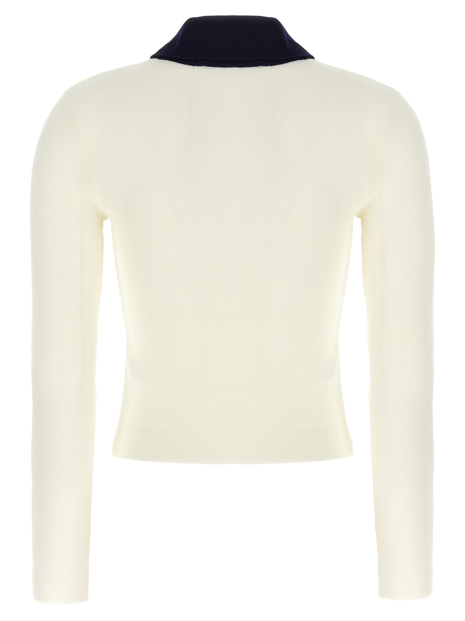 Merino wool Cream Merino Wool cardigan with contrast shirt collar, front button closure, and long sleeves.