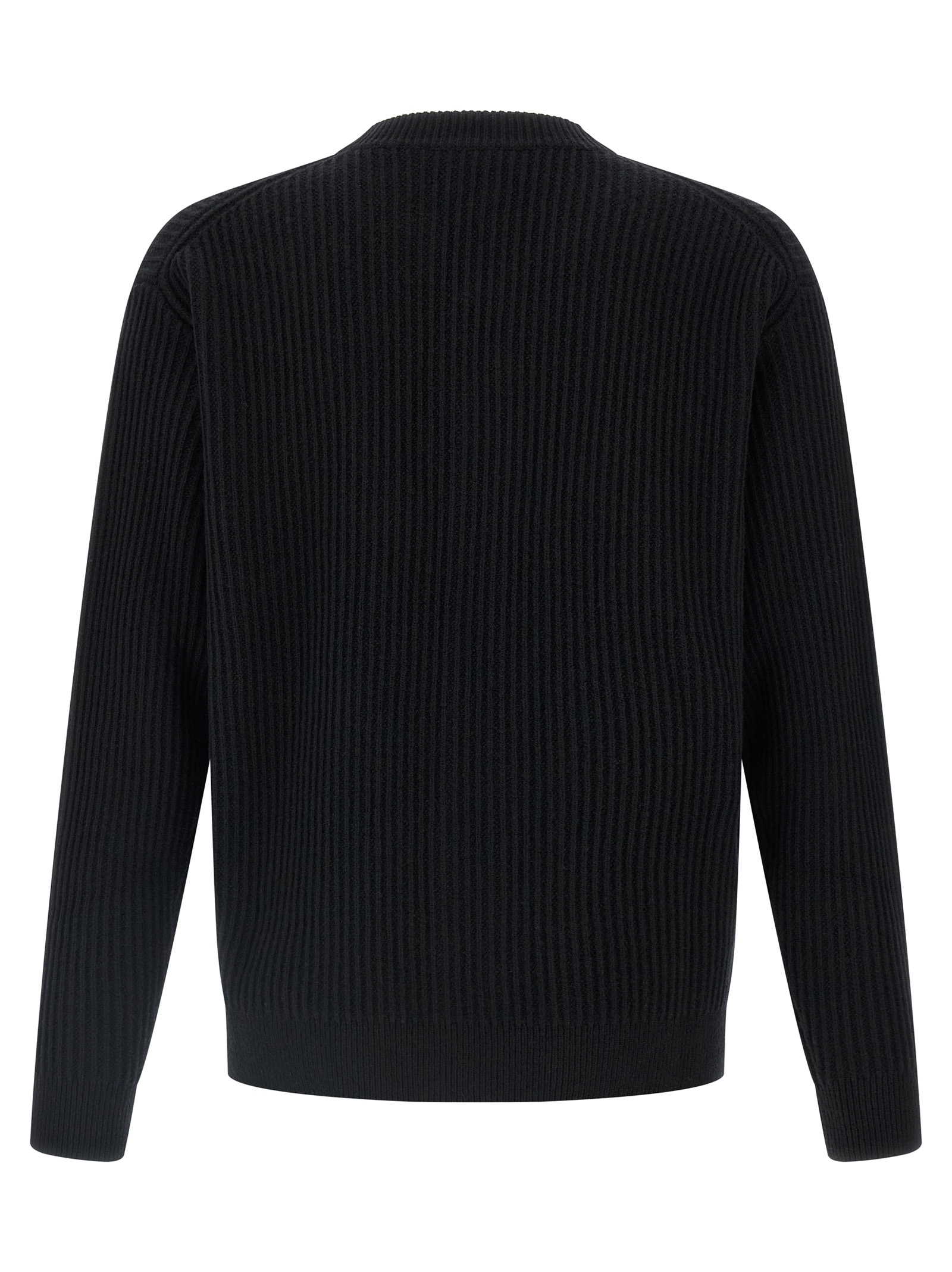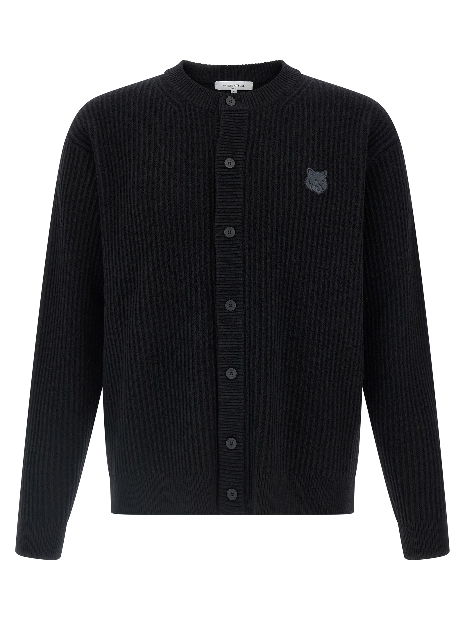 Ribbed wool cardigan, tone-on-tone 'Fox Head' patch and front button closure, round neckline, long sleeves with dropped shoulders.